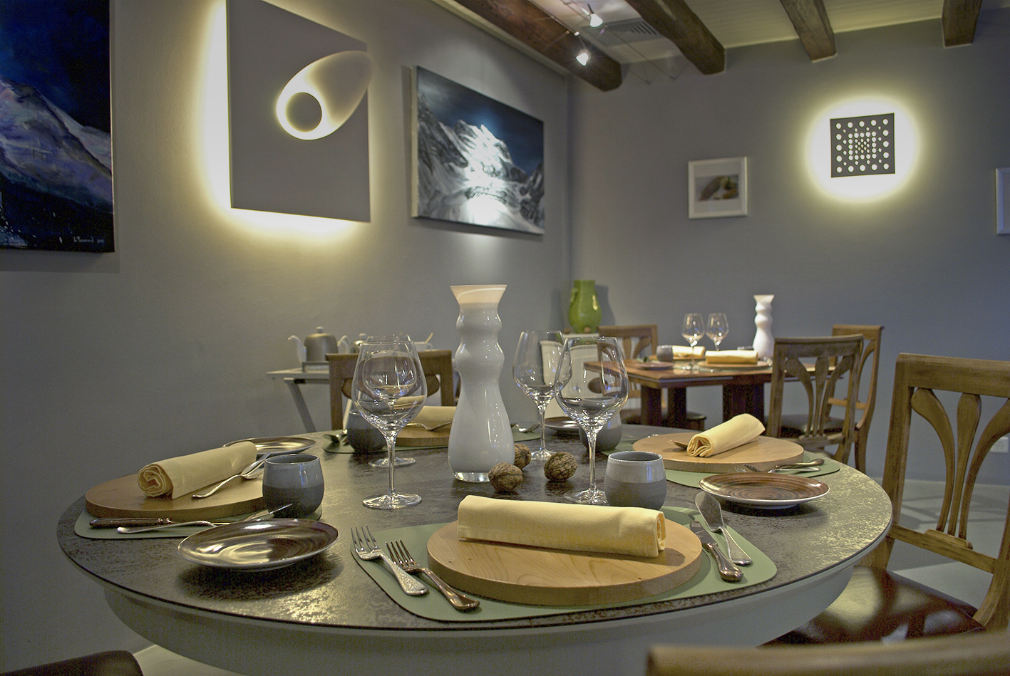 Comme à l’époque du Montagne, à Chardonne, David Tarnowski est attentif à chaque détail. Dans la salle «grise», qui est l’espace gastronomique jouxtant la brasserie, les tables et chaises de noyer sont confectionnées par des artisans locaux. Ecoresponsable, sa vaisselle en céramique est elle en accord avec les disques de sapin faisant office de dessous d’assiette, tandis que dans une cagette on aperçoit les nouvelles planchettes sur lesquelles seront déposées les mignardises. Quant au décor, il est à l’unisson: les poutres blanchies arborent des champignons stabilisés, conférant au lieu un charme organique renforcé par les toiles de l’artiste peintre Ludovic Perrenoud, variations de paysages alpins sous forme de clins d’œil aux randonnées sur les glaciers suisses dans lesquelles David Tarnowski embarque chaque année sa famille. Ce rituel? Une manière de se confronter à la fois au changement climatique et au souvenir de ses visites successives à la Mer de Glace. «En 1990, on la voyait de près; en 2018, elle était grise et moche, sans compter qu’il fallait descendre plus de 600 marches pour y accéder. Un choc.»