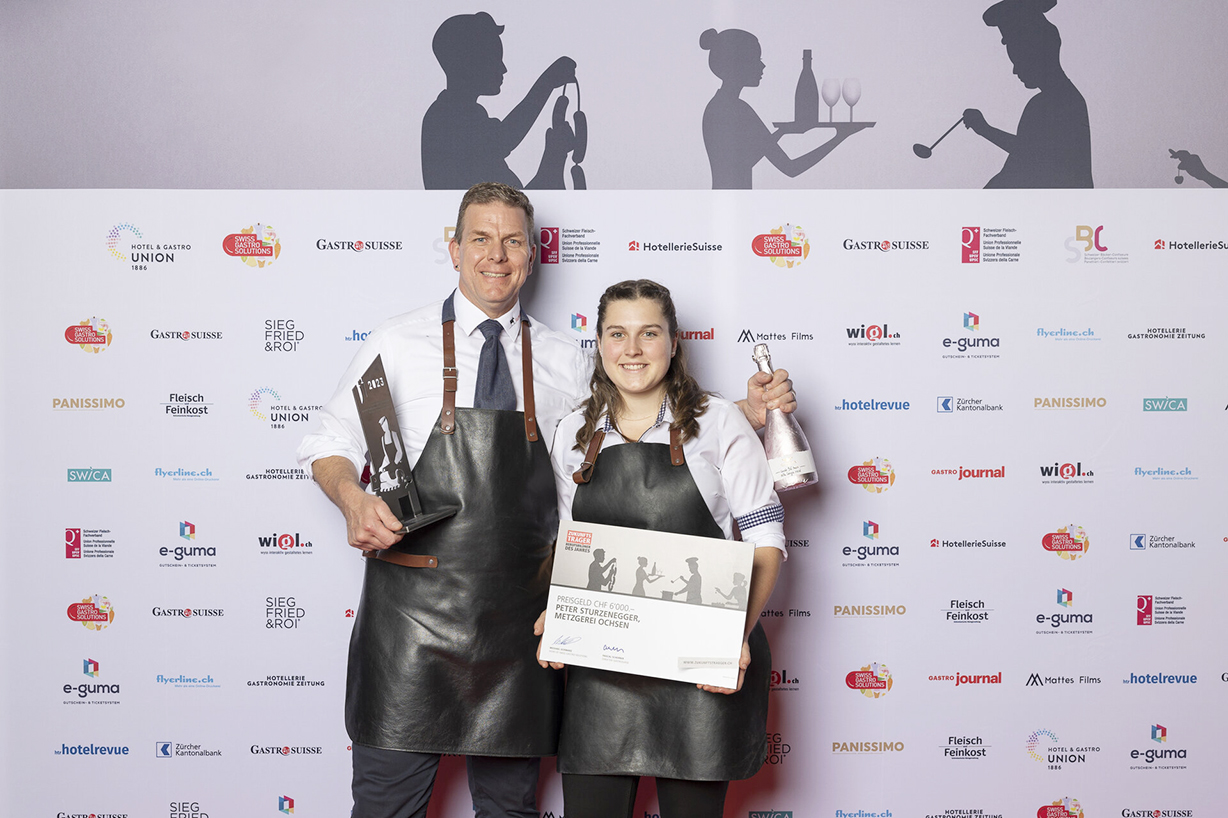«Si nous gagnons, nous allons vraiment nous défouler», a promis Peter Sturzenegger avant la remise des prix. Il dirige la boucherie Ochsen et l’auberge attenante à Schwellbrunn (AR), en mains familiales depuis trois générations. C’est Ronja Koch qui a désigné Peter Sturzenegger comme Porteur d’avenir. L’apprentie apprécie le fait que son formateur lui consacre du temps et la forme de manière optimale. Peter Sturzenegger aime travailler avec la relève professionnelle. «Le contact avec les jeunes me permet de rester en forme», dit-il.
