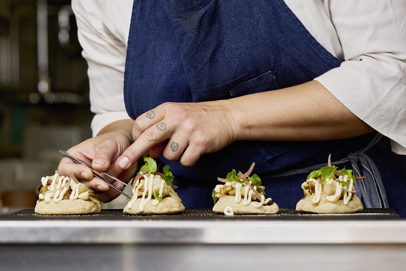 A Lohn, village grison d’à peine cinquante habitants et davantage de bovins, la jeune cheffe organise des événements culinaires où manger «en pleine conscience» dans la fermeauberge familiale. Tout est bio et local, de l’assiette aux couteaux et au brasero; les vaches gardent leurs cornes et sont nourries à l’herbe et au foin du domaine, au milieu d’un riche écosystème, à 1600 m d’altitude. Tout est transformé sur place, céréales, légumes, viandes, laitages, selon une philosophie Nose to Tail et zéro déchets. Rebecca travaille la flore sauvage et va jusqu’à renoncer au poivre, remplacer le café par des infusions maison, la cannelle ou le cacao par des plantes poussant à sa porte: «La nature est riche de tellement de parfums et de goûts, en découvrir de nouveaux me procure le bonheur d’un peintre qui découvrirait une nouvelle couleur.» De même, Rebecca fait son pain et son fromage elle-même, ainsi que des fermentations et autres conserves persos.