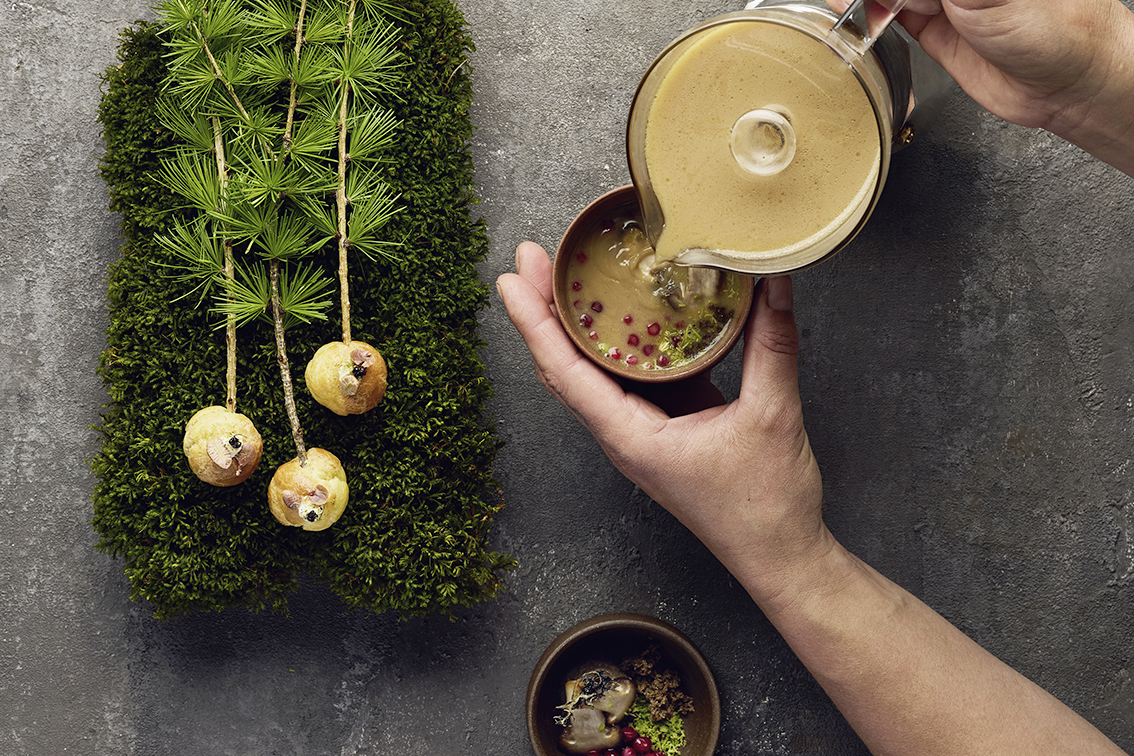 L’idée est de rapprocher autant que possible agriculture et gastronomie, d’amener la quintessence des Alpes dans l’assiette, dit encore celle qui trace un parcours à part dans l’univers culinaire actuel. Précédemment, elle avait impressionné son auditoire à Ljubljana, dans le cadre du European Food Summit, en évoquant sa philosophie cent pour cent naturelle. Son parcours lui a valu de nombreuses distinctions – de la victoire de son équipe lors des championnats du monde de cuisine, en 2010, au Mérite culinaire, en 2021, dont la plus prestigieuse fut évidemment le titre de Food Heroe, décerné par l’Organisation pour l’alimentation et l’agriculture (FAO) en 2022. «Chaque aliment a une histoire, un territoire, une saison, que j’évoque avant de servir les plats.» Ses menus à thèmes se nomment ainsi Flora elvetica ou Rätien et racontent cette région prodigue de beautés, à travers toute la gamme de nos perceptions, les Alpes, la vallée, chaque mets étant associé à une boisson, avec ou sans alcool. Le pinot noir implanté dès l’époque romaine dans les Grisons lui inspire notamment un plat associant le cassis au cépage, proposé avec une kombucha à base des raisins de pinot séchés.