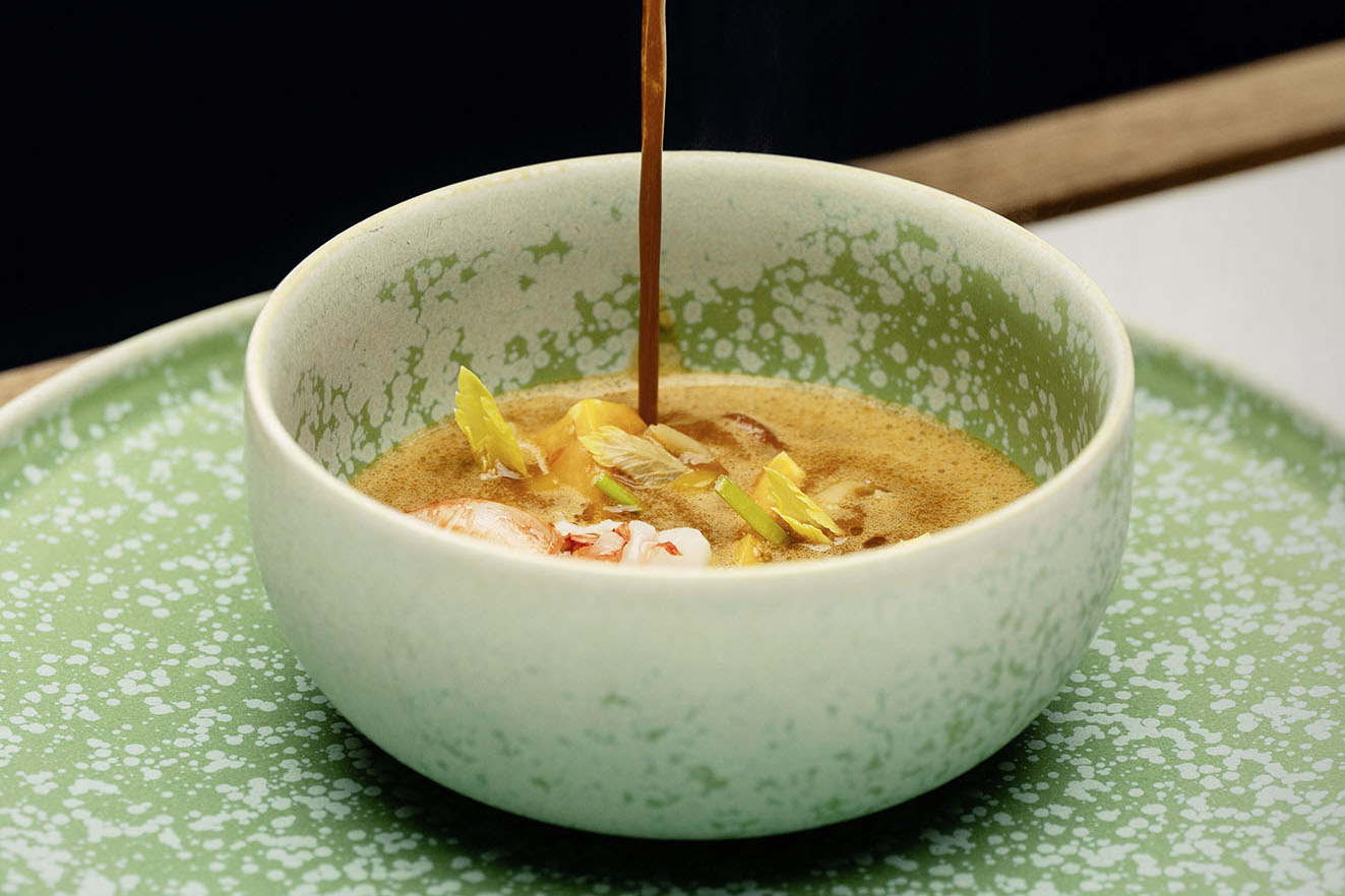 A choisir entre les trois menus proposés, la version végane incluant plusieurs plats de la gamme Planted (la start-up suisse dont il est un grand fan et l’ambassadeur), le menu colibri hommage à Berlin et le menu koi, invitation au voyage à travers les couleurs de l’Asie, on est logiquement tentés par ce dernier. Tim Raue raconte volontiers combien il a été marqué par sa découverte de ces saveurs autres, voici une quinzaine d’années lors d’un voyage clé à Singapour, Bangkok, Tokyo et Hong Kong. «J’aime l’audace du répertoire thaï et ses épices dans leurs multiples déclinaisons, les techniques chinoises et le purisme japonais. »