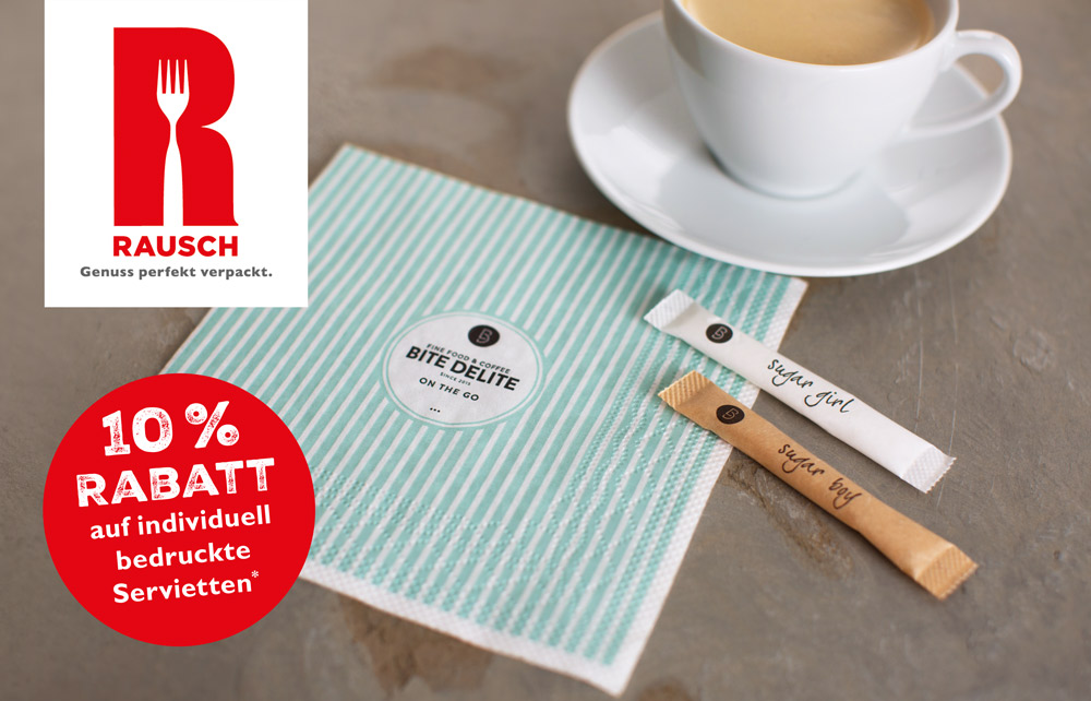 *Aktionsbedingungen sind auf www.rausch-packaging.ch/servietten-aktion zu finden. Die Aktion, die für ausgewählte Servietten gilt, dauert vom 3. September bis 15. Oktober 2021.
