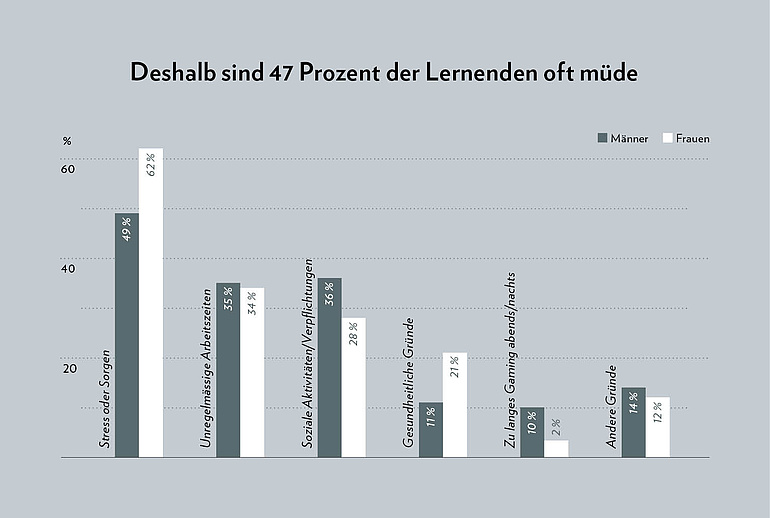 In Zusammenarbeit mit der Organisation «Akzent», Prävention und Suchttherapie Luzern, wurden die Lernenden erstmals auch zu ihrer Social-Media-Nutzung, ihrem Gamingverhalten und Bezug zu Suchtmitteln befragt. Fast die Hälfte der Lernenden spielt pro Tag mehr als eine Stunde. 54 Prozent der Befragten verbringen täglich mehr als drei Stunden mit dem Smartphone. Von den 47 Prozent, die angeben, oft unausgeschlafen zu sein, führen dies aber nur zwei Prozent der Frauen und zehn Prozent der Männer auf zu langes Gamen oder Handykonsum zurück. Bei den Suchtmitteln stehen Alkohol, Energy Drinks und Nikotin hoch im Kurs.