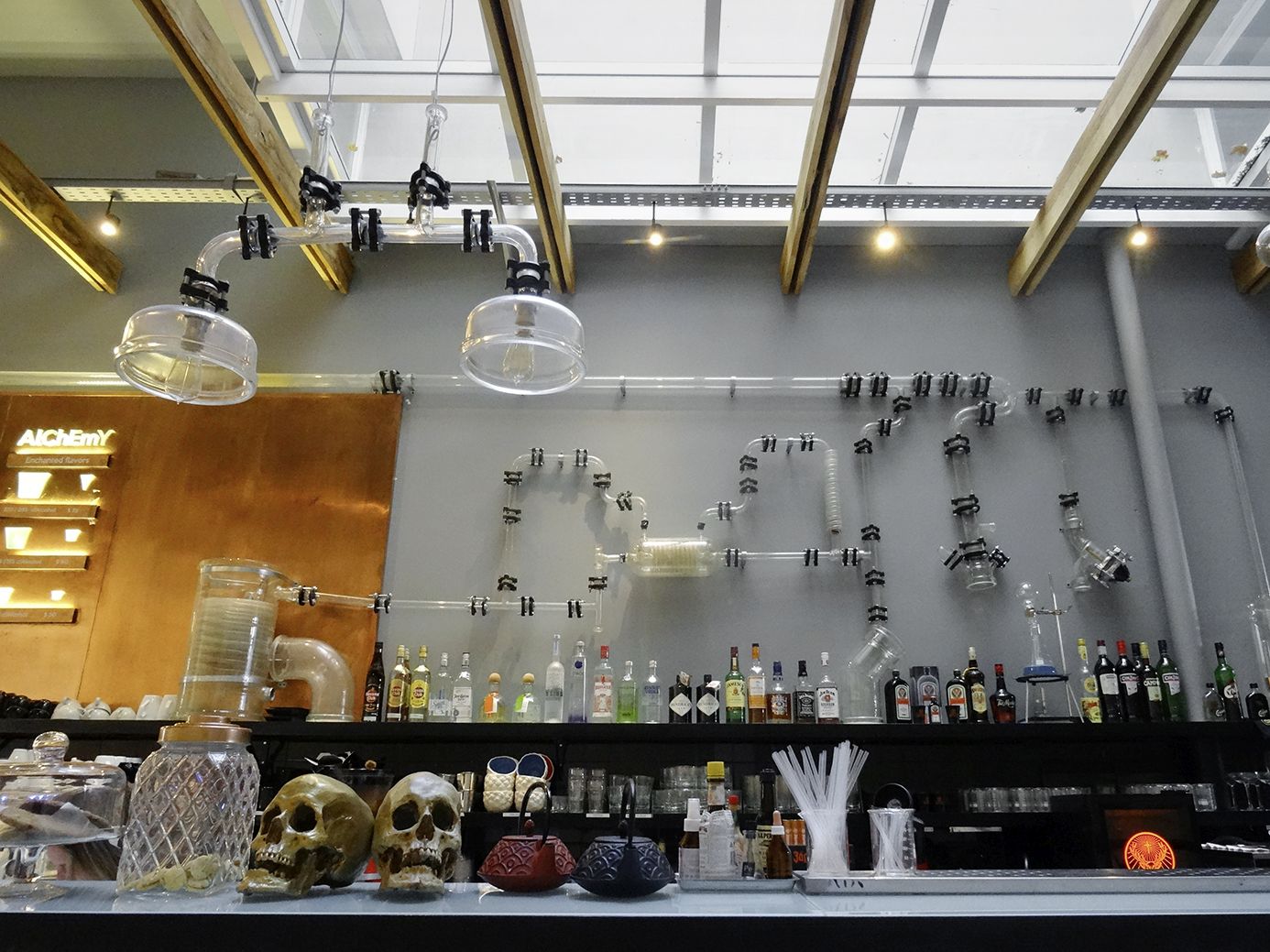 Alchemy a l’air d’un laboratoire. Celui d’un chimiste fou. Des formules sont gribouillées sur les hauts murs de la pièce, des engrenages à l’apparence de métal rouillé font office de tables, fioles et éprouvettes jonchent le bar, en arrière-plan des tuyaux transparents s’emboîtent. Pourtant, dans le congélateur, plutôt que des échantillons, ce sont des glaces aux couleurs envoutantes et aux saveurs les plus inattendues qui s’offrent aux yeux des visiteurs. Leurs parfums sont présentés dans un gigantesque tableau périodique des éléments.