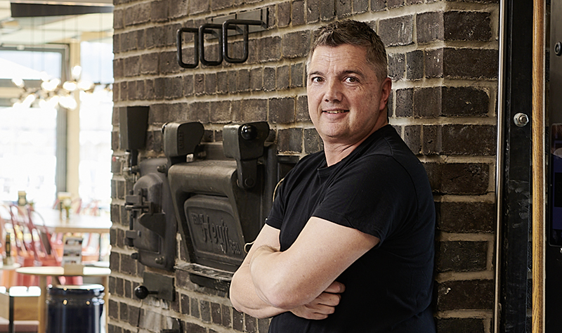Wir blicken Koch Nicolas Zwahlen über die Schulter. Er ist zuständig für die Sandwichproduktion und belegt vor unseren Augen ein ganzes Arsenal an Brotscheiben. Auch das «Houzofä Büezer»-Sandwich, wie es korrekt heisst, entsteht hier. «Wie der Name besagt, verwenden wir dafür unser Holzofenbrot», erklärt Burkhard. Nicolas bestreicht beide Brotscheiben mit einem Aufstrich aus Margarine, Gewürzen und etwas Senf. Anschliessend nimmt er den bereits tranchierten Schinken und die Salami zur Hand und belegt die Brotscheiben damit. Obendrauf legt er eine Essiggurkentranche und die zweite Brotscheibe des Sandwiches.