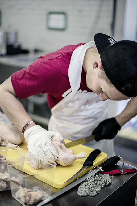 • Nico Mazzolini nimmt fachmännisch ein Poulet aus.