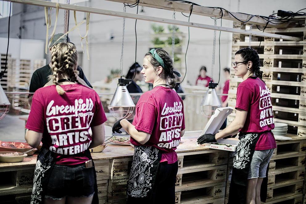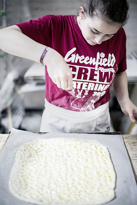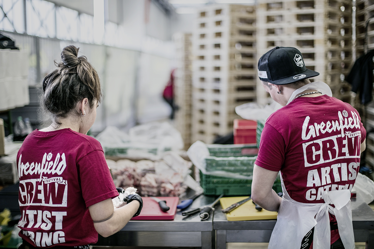 Ab 4 Uhr in der Früh werden fürs Frühstück Zopf, Gipfeli und Co gebacken. Später kommen Rinderviertel auf die offene Feuerstelle. Pizza, Pasta, Poulet – alles wird frisch zubereitet. Mit dabei ist auch Reto Walther, Geschäftsführer des Schweizer Kochverbands. Er packt an, hilft René Schudel, das ganze Lamm zu drehen, das über dem Feuer sechs Stunden lang schmort. «Was die Jungen leisten, ist beeindruckend», findet Reto Walther. «Sie kennen sich noch kaum, aber aufgrund der aussergewöhnlichen Umstände bildet sich schnell ein Team.» Melina Schenk und Nico Mazzolini stehen beide vor ihrer Abschlussprüfung. Dass sie Poulets ausnehmen müssen, kommt ihnen entgegen. Nico Mazzolini: «Das müssen wir für die Prüfung können. Eine perfekte Vorbereitung.» Schon fertig mit der Lehre ist Vanessa Hauser. «Als ich noch in der Lehre war, durfte ich nicht freinehmen», erzählt sie. «Da ich die Musik liebe und privat schon am Greenfield Festival war, wollte ich unbedingt mal mitmachen.» Sagt es und konzentriert sich wieder aufs Spargeln schälen.