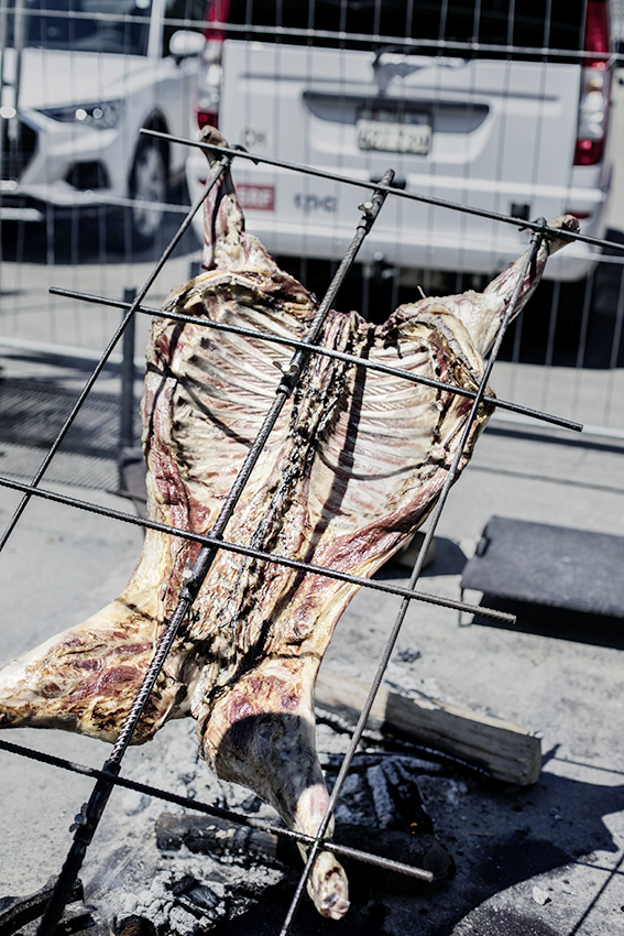 • Das Lamm schmorte sechs Stunden über dem offenen Feuer.