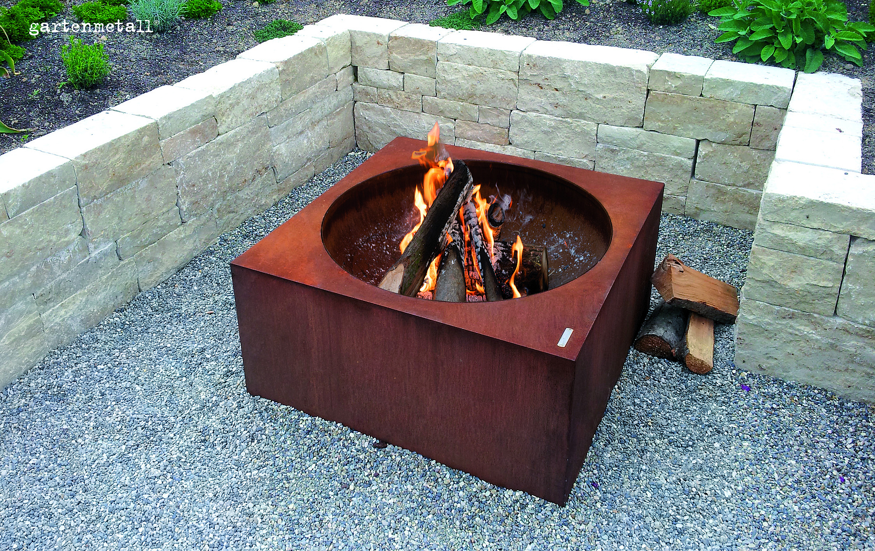 Feuerstelle mit Edelrostoptik Troja heisst ein beliebter Klassiker von Atlas Natursteine aus Marthalen und ist ein moderner Kubus mit integrierter Feuerschale. Mit den verschiedenen Grillrosten wird die Feuerstelle zur hochwertigen Grillstelle. Preis: ab 1005 Franken exkl. MWST. www.atlas-natursteine.ch (ZVG)
