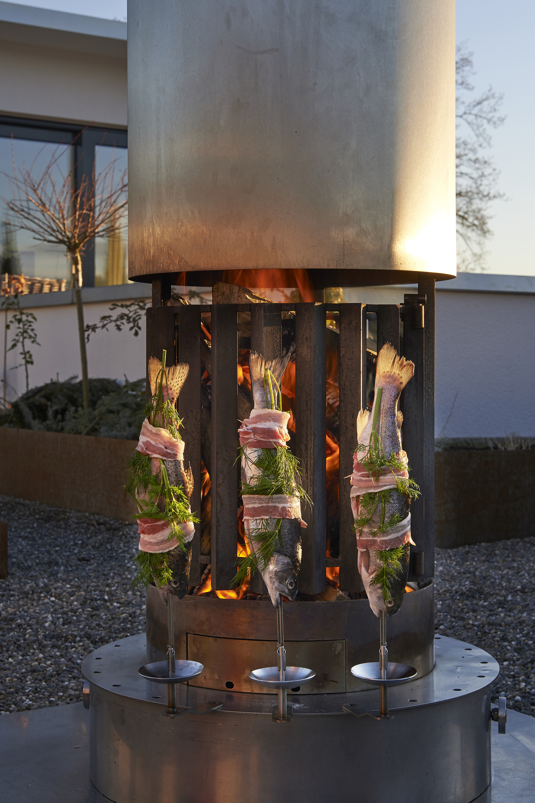Das Feuerrohr Grill? Wärmespender? Skulptur? Das Feuerrohr von Uli Sorglos vereinigt Form und Funktion. Dank dem stufenlos höhenverstellbaren Rohr feuert man in Windeseile an – der Rauch wird optimal nach oben abgezogen. Auf dem EdelstahlSockel können bis zu 20 Positionen zum Grillieren bestückt werden. Preis: 4500 Franken. www.sorglos-design.ch (ZVG)