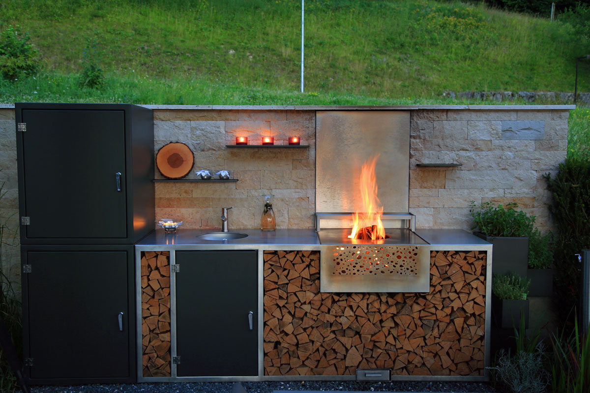 Flamma Culina Mit Flamma Culina bietet die in Birmenstorf (AG) beheimatete Wetzel AG eine LuxusOutdoorküche speziell für die Gastronomie. Grilliert wird direkt auf der Edelstahlplatte neben dem offenen Feuer. Komplettiert wird das Angebot durch einen Wasseranschluss, Kühlschrank und Ablagefächer in jeder gewünschten Form. Preis: ab 8000 Franken. www.flammengrill.ch (ZVG)