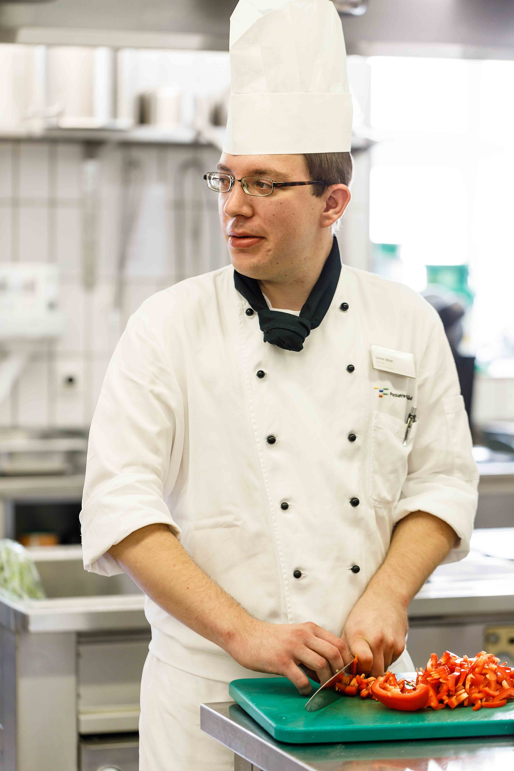 «Jeder hat eine Chance im Leben verdient. Und zwar nicht nur eine. Manchmal braucht es zwei oder drei», sagt Patrick Schwendener. Der Küchenchef der psychiatrischen Klinik in Pfäfers schafft Platz für diejenigen, die sonst nicht unterkommen würden. «In unserer Gesellschaft wird so viel gefordert. Körperlich oder psychisch Beeinträchtigte gehen völlig unter», erklärt Schwendener. So kam Werner Wagner nur ein Jahr nach seinem Schlaganfall ins Küchenteam zurück. Und auch Simon Wüst ist seit sieben Jahren in der Klinikküche tätig. «Für mich wäre es das Schlimmste gewesen, wenn ich nie wieder als Koch hätte arbeiten können. Das war immer mein Lichtblick, es hat mich zusammengehalten», erinnert sich Werner Wagner. Schritt für Schritt mobilisierte er die gelähmte Seite, kam vom Rollstuhl ins Stehen, dann ins Gehen. Das Sprechen war glücklicherweise kein Problem, doch die Feinmotorik in die Hände zurückzubringen, schien unmöglich. Das Kochen gab er dennoch nicht auf und kochte für seine Therapeutinnen. «Sie wollten, dass ich spezielle Schneidebrettchen verwende, an denen man mit einer Hand arbeiten kann, doch ich nahm sie nie. Der Kopf wollte schon immer mehr als die Hand. Ich bin ein Kämpfer», erzählt Wagner.