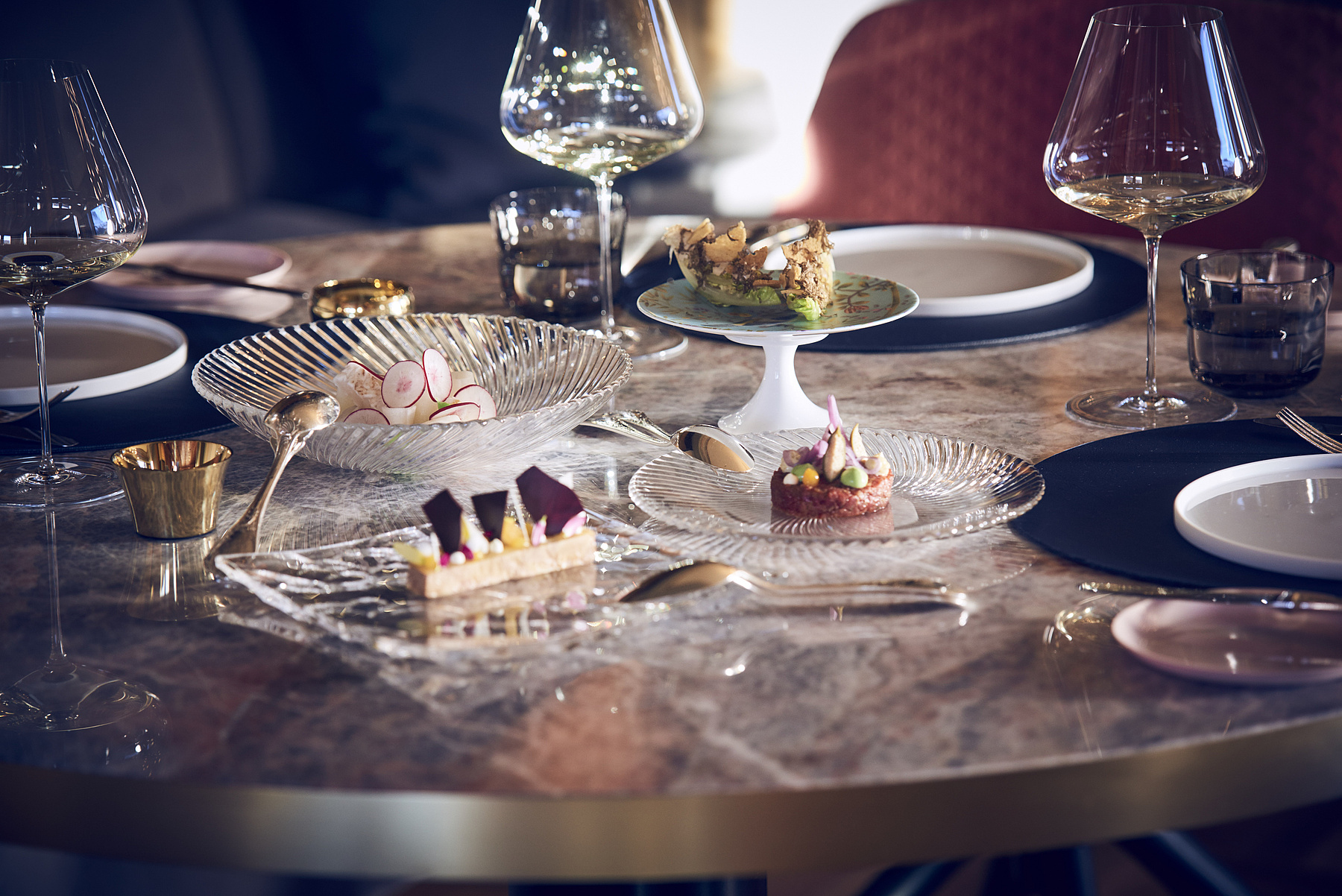 Den Gast erwartet ein «Fine Dining Sharing Experience», ein kulinarischer Höhenflug zum Teilen also. Sieben Vorspeisen, darunter ein Escabeche vom Zander oder die legendären Kopfsalatherzen mit Trüffeln füllen den Tisch. Man probiert von hier und greift sich Stückchen von dort. Bei den fünf Hauptspeisen ragt die stundenlang geschmorte Rindshaxe an Rotweinsauce heraus, beim Dessert sind es vielleicht die Engadiner Bergspitzen, die Schweizer Antwort auf die Salzburger Nockerln. Die Meinungen gehen auseinander, man gönnt sich einen Löffel von dem und ein paar Bissen vom anderen, ganz locker und ungezwungen.