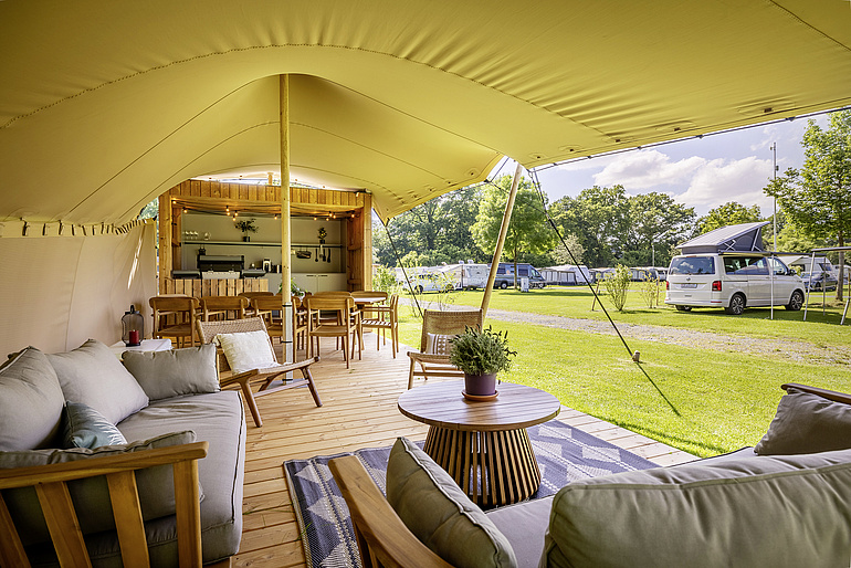 Ein Private-Camp-Stellplatz bringt den Campern den Komfort von Küche, Bad und überdachter Terrasse. (ZVG)