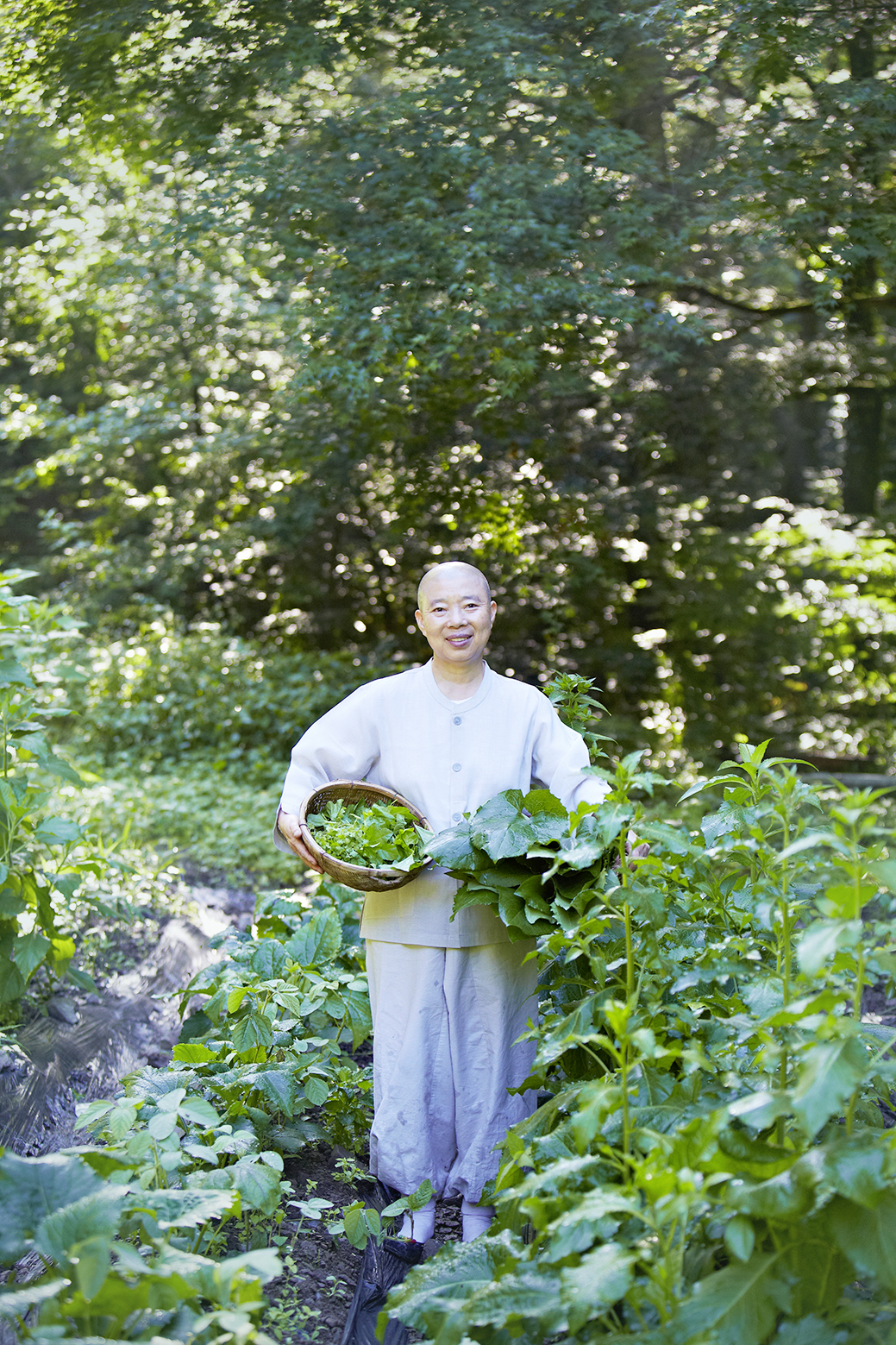 Je me lève à cinq heures et c’est alors un temps consacré au chant et à la méditation. A six heures, je vais voir quels seront les ingrédients pour préparer les repas du jour. Le jardin se trouve sur mon chemin, à côté du lieu de prière: je m’y promène pour regarder, choisir et cueillir les ingrédients des prochains repas. A 7 heures, nous prenons le petit déjeuner, suivi d’une courte pause. Vers 9 heures, nous planifions le déjeuner en fonction du nombre de convives, de la saison, des ingrédients disponibles, et nous nous mettons en cuisine. Nous sommes trois à vivre à l’ermitage, mais le nombre de convives change chaque jour, selon que nous avons des visiteurs ou que je cuisine pour les moines. Quand nous avons fini la préparation, nous mangeons tous ensemble au monastère vers midi: c’est généralement très simplifié par rapport au rituel complet du Baru Gongyang. L’après-midi est consacré à la méditation; ensuite je prépare le dîner, souvent avec les restes, des choses très simples et nous dînons à 18 heures. Nous nous réunissons pour la prière et l’échange du jour et à 22 heures c’est l’heure du coucher. Selon la saison, je consacre plus de temps au jardinage, aux semences, aux récoltes et aux travaux d’entretien. Je vais aussi cueillir des herbes et des ingrédients sauvages et je me rends parfois au marché. Avant l’hiver, je commence aussi à préparer les conserves et à mettre les légumes à fermenter.