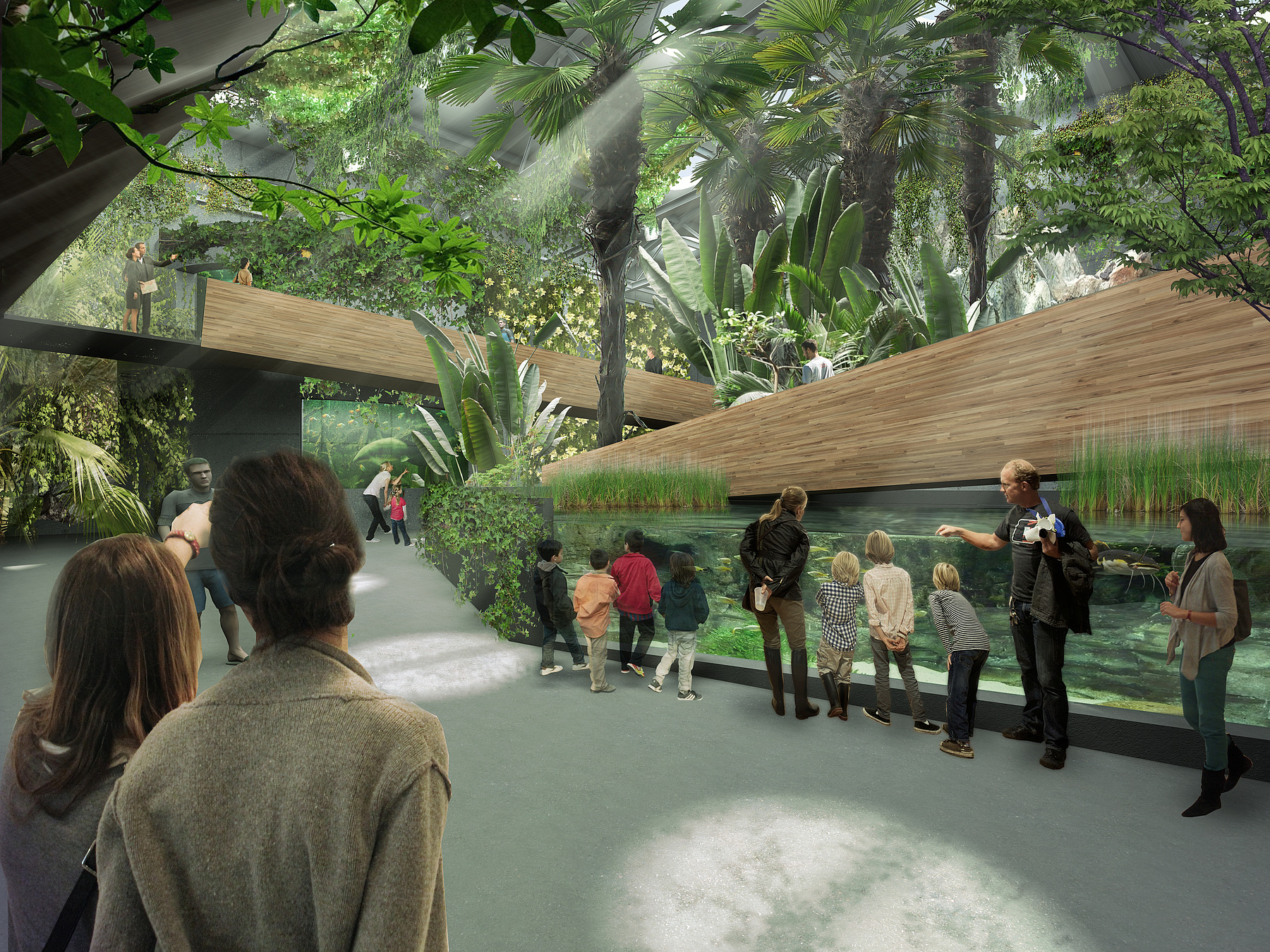 Des régions tempérées, le visiteur accédera ensuite à l’Afrique, avec notamment son bassin de crocodiles sacrés, que les visiteurs verront nager. Au coeur du bâtiment et sur ses deux niveaux, la serre tropicale géante de 533 mètres carrés accueillera les espèces impressionnantes de la forêt amazonienne, des piranhas aux pacus. La visite se poursuit du côté de l’Asie, ses mangroves et l’écosystème particulier de ses rizières, mais aussi l’Indonésie et le varan de Komodo. Au total, 20 écosystèmes et 46 aquariums-vivariums alimentés par deux millions de litres d’eau douce accueilleront une centaine de reptiles et quelque 10 000 créatures aquatiques des cinq continents.