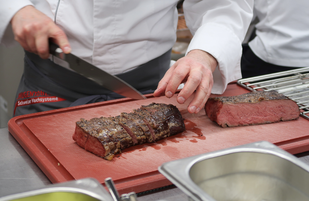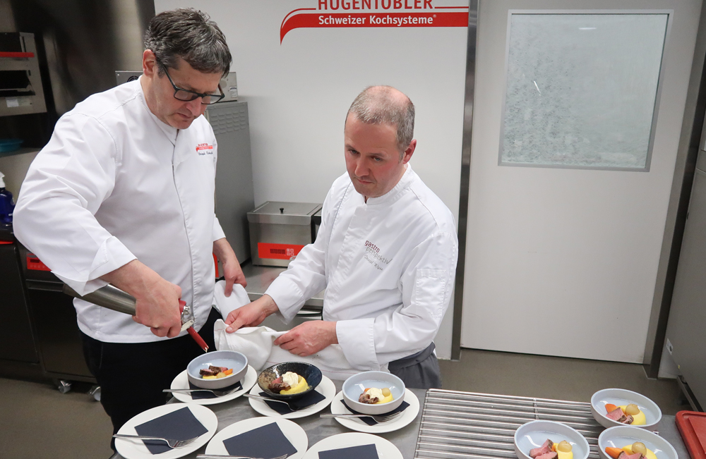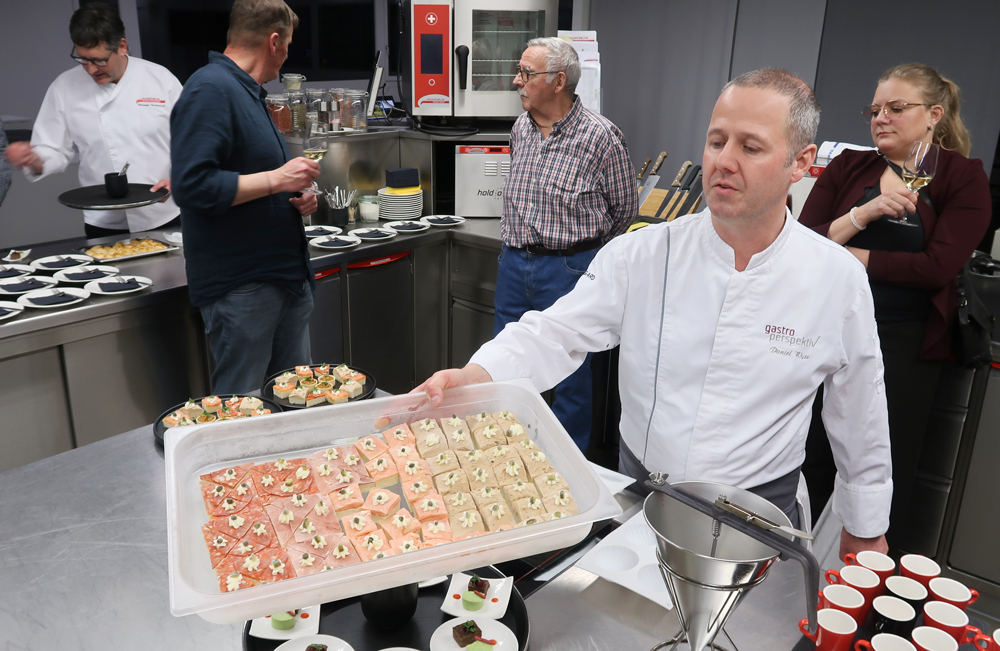 In der Schulungsküche erzählte Daniel Wyss von Gastro Perspektiv, einem Tochterunternehmen von Hugentobler, aus der Praxis. Der Kochcoach kennt die optimalen Abläufe. So wird heute vielerorts in einer Schicht gearbeitet und am Nachmittag produziert, schockgefrostet oder pasteurisiert. Nebst den Häppchen konnten die Teilnehmenden weitere Gerichte probieren und sich von dieser Art des Kochens überzeugen.