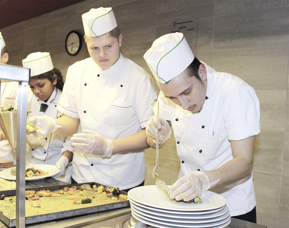 Es folgten der Fisch- und der Hauptgang. Diese hatten es in sich. Die Instruktoren der überbetrieblichen Kurse und Berufsschullehrer verarbeiteten 80 Kilogramm Rindsfilet, 250 Kilogramm Gemüse und 110 Kilogramm Meerwolfsfilet. Mit Hilfe der Lernenden wurden die Teller frisch angerichtet und fanden den Weg im Lawinenservice auf die Tische. In Windeseile wurden so sämtliche Gäste bedient.