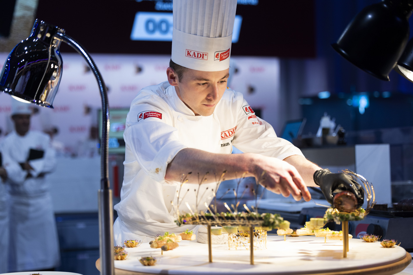 Die erste Aufgabe lautete, ein Fischgericht aus Saibling mit vegetarischen Garnituren zuzubereiten. Dabei mussten Haselnüsse und Frischkäse eingearbeitet werden. Bei der zweiten Aufgabe galt es, ein Schweizer Kalbsnierstück und zwei Schweizer Kalbszungen zu verarbeiten. Die Pflichtzutaten dabei: Rhabarber und Rosapfeffer. Spitzenkoch Ivo Adam, der gemeinsam mit Moderator Sven Epiney durch den Wettkampf führte, fand viele lobende Worte für Shaun Rollier. «Er hat eine klare Handschrift, arbeitet sehr detailorientiert und bringt Harmonie auf den Teller», sagte er beim Probieren des Hauptgangs.