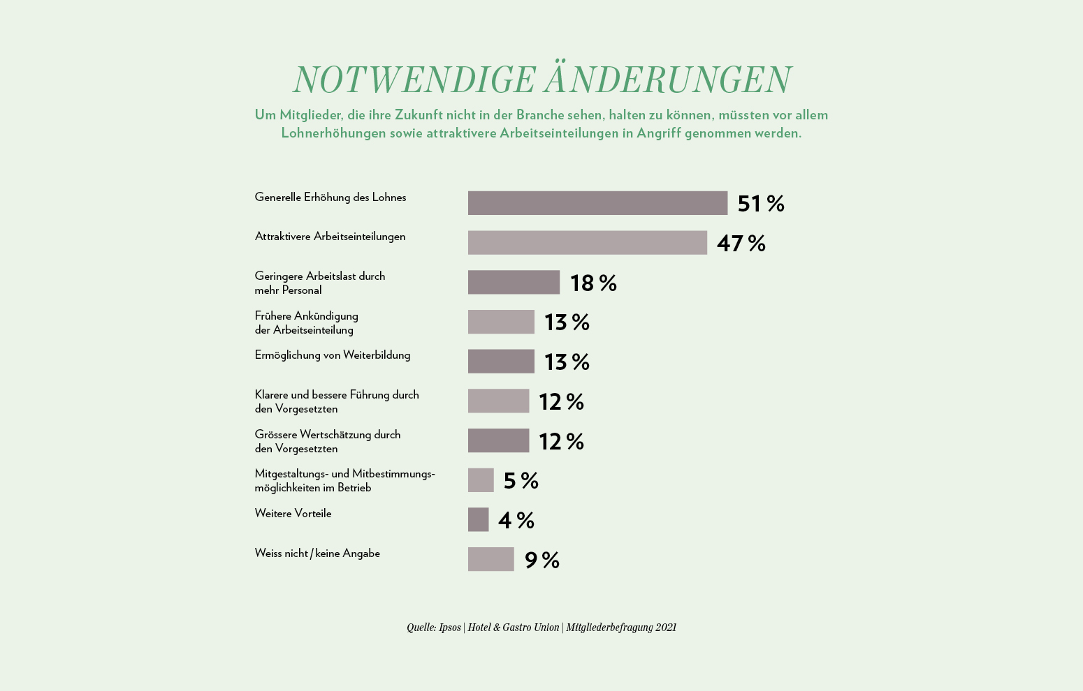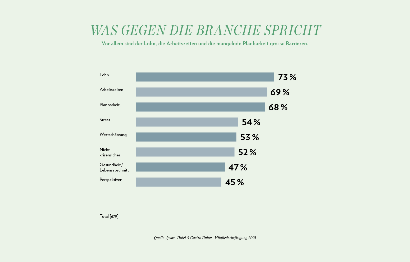 Mehr als 2000 Mitglieder antworteten auf die Ende letzten Jahres online durchgeführte Umfrage. Eine der wichtigsten Erkenntnisse: Die Zahl jener, die für sich eine Zukunft in der Branche sieht, ist seit 2019 geschrumpft. Während vor der Pandemie noch 81 Prozent der Befragten antworteten, «sicher oder vermutlich schon» in der Hotellerie und Gastronomie zu bleiben, waren es Ende 2021 noch 67 Prozent der Mitglieder. 18 Prozent wollen der Branche den Rücken kehren. Dies trifft besonders auf Arbeitnehmende ohne Vorgesetztenfunktion beziehungsweise auf Arbeitssuchende zu. Die grössten Barrieren, die gegen einen Verbleib in der Hotellerie- und Gastronomiebranche sprechen, sind der Lohn und die Arbeitszeiten.