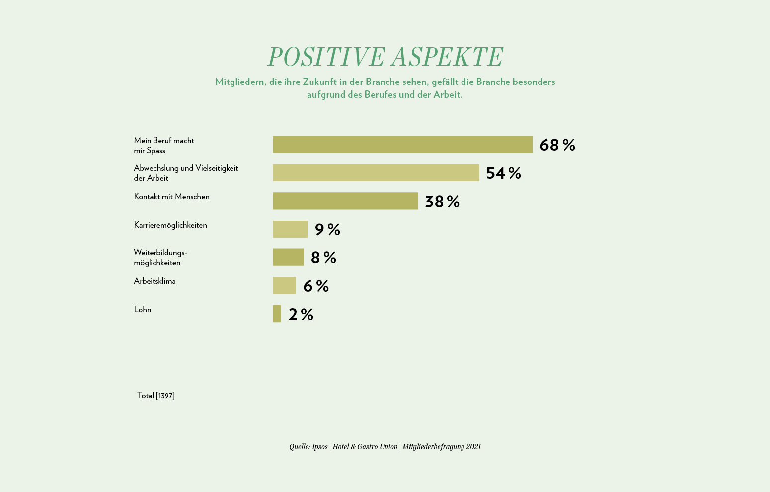 Jene Befragten, die sicher sind, in der Hotellerie und Gastronomie weiterarbeiten zu wollen, äusserten sich zu positiven Aspekten der Branche. Aus einer Vielzahl von Gründen heben 68 Prozent der Mitglieder hervor, dass sie Spass am Beruf haben. 54 Prozent gefällt die Abwechslung und die Vielseitigkeit ihrer Arbeit.
