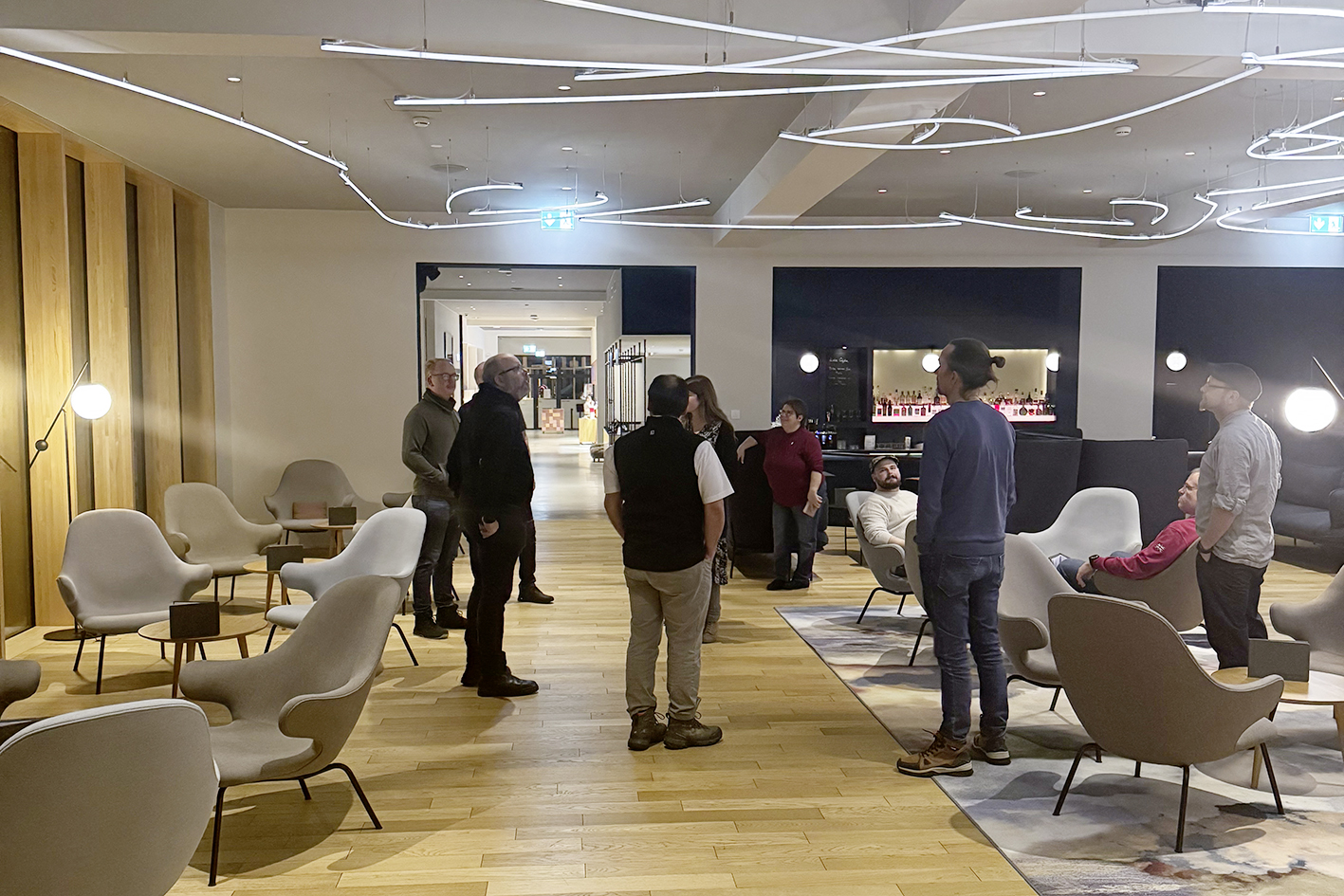 Bei leichtem Schneefall machten sich die Mitglieder später auf den rund 15-minütigen Weg zur Stoos Lodge. Dort wurden sie von Michael Zboron begrüsst, der bei einem Rundgang das im Jahr 2022 eröffnete Hotel und die Küche präsentierte. Besonders beeindruckte die Stammtischrunde die nachhaltige Ausrichtung und die durchdachte betriebliche Organisation – insbesondere im Hinblick auf Produktivität und die vorausschauende Bewältigung des Fachkräftemangels im Gastgewerbe.