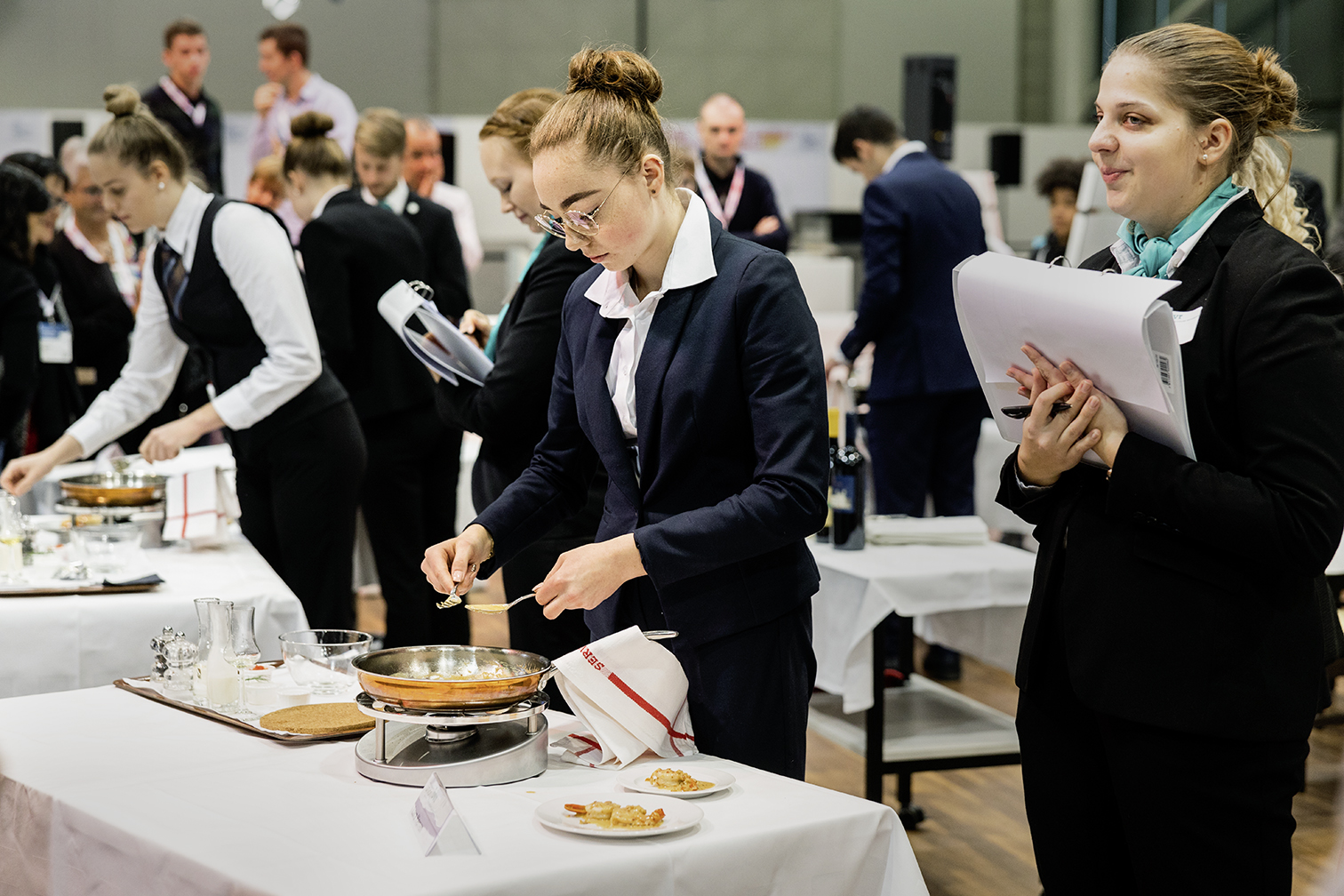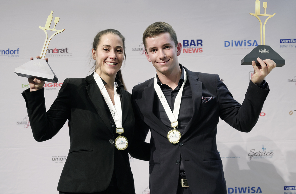 Egal, ob in der Königsdisziplin, dem Flambieren von Krevetten, in der Überraschungsdisziplin Mystery oder beim Erkennen von Käsesorten: Die 25 Teilnehmerinnen und Teilnehmer der Servicemeisterschaft 2019 absolvierten den Wettbewerb des Berufsverbandes Restauration bvr souverän und mit viel Freude. Auch wenn Hände zitterten, Wein verschüttet wurde oder man zu spät zur Disziplin erschien – die angehenden oder ausgelernten Restaurationsfachfrauen und -fachmänner überzeugten die Juroren durch Fachwissen und Professionalität. «Die Kandidaten liessen sich nicht erschüttern und präsentierten sich als professionelle Gastgeber. Solche Personen brauchen wir im Beruf», so Christoph Muggli, Präsident bvr und der Wettbewerbskommission (Weko). Alle Teilnehmer erhielten eine Tasche voller Sachpreise. Am meisten überzeugten Adélie Chatton und Jacob Schümperli. Die Restaurationsfachfrau vom Café des Avenues in Lausanne/VD darf sich Servicemeisterin 2020 nennen. Unter Tränen nahm sie an der feierlichen Siegerehrung durch die Hotel & Gastro Union am Ende der Igeho den Pokal von der abtretenden Servicemeisterin Tamara Haab entgegen. «Danke, vielen Dank. Ich bin superglücklich, hier als Vertreterin der Westschweiz gewinnen zu dürfen», waren ihre ersten Worte. Die 31-Jährige war eine von sechs Goldmedaillengewinnern und zitterte bis zuletzt mit der ebenfalls ausgelernten Lisa Schmid vom Restaurant Schützen in Steffisburg/BE um den Titel.