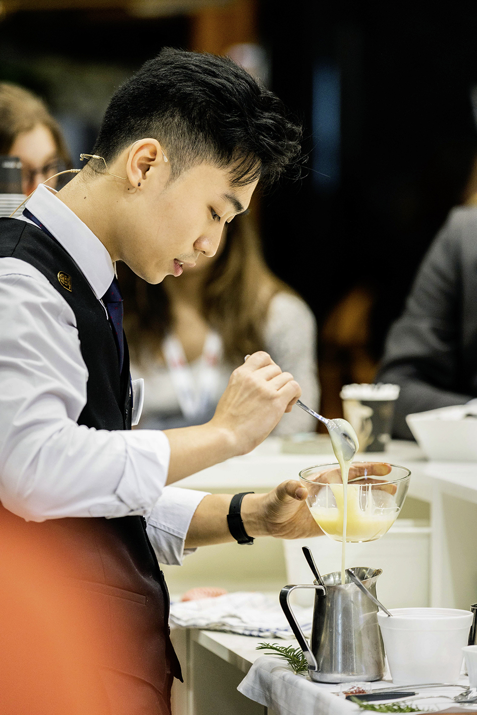 Do Dinh Dong übertrug das Motto für die Erlebnistische in die Disziplin Barista und stellte seine Eigenkreation eines Kaffeegetränks in den Farben der fünf Elemente dar. Cheyenne Gut servierte einen Capl: eine Kreation aus Kaffee und Apfel in verschiedenen Temperaturen. Sie brachte alle benötigten Bar-Utensilien selbst mit und liess eigens für die Servicemeisterschaft eine hölzerne Unterlage schreinern, um sie herbstlich zu verzieren. «Die Präsentation dieses Kaffeegetränks wird mir am Qualifikationsverfahren als Verkaufsgespräch dienen.»