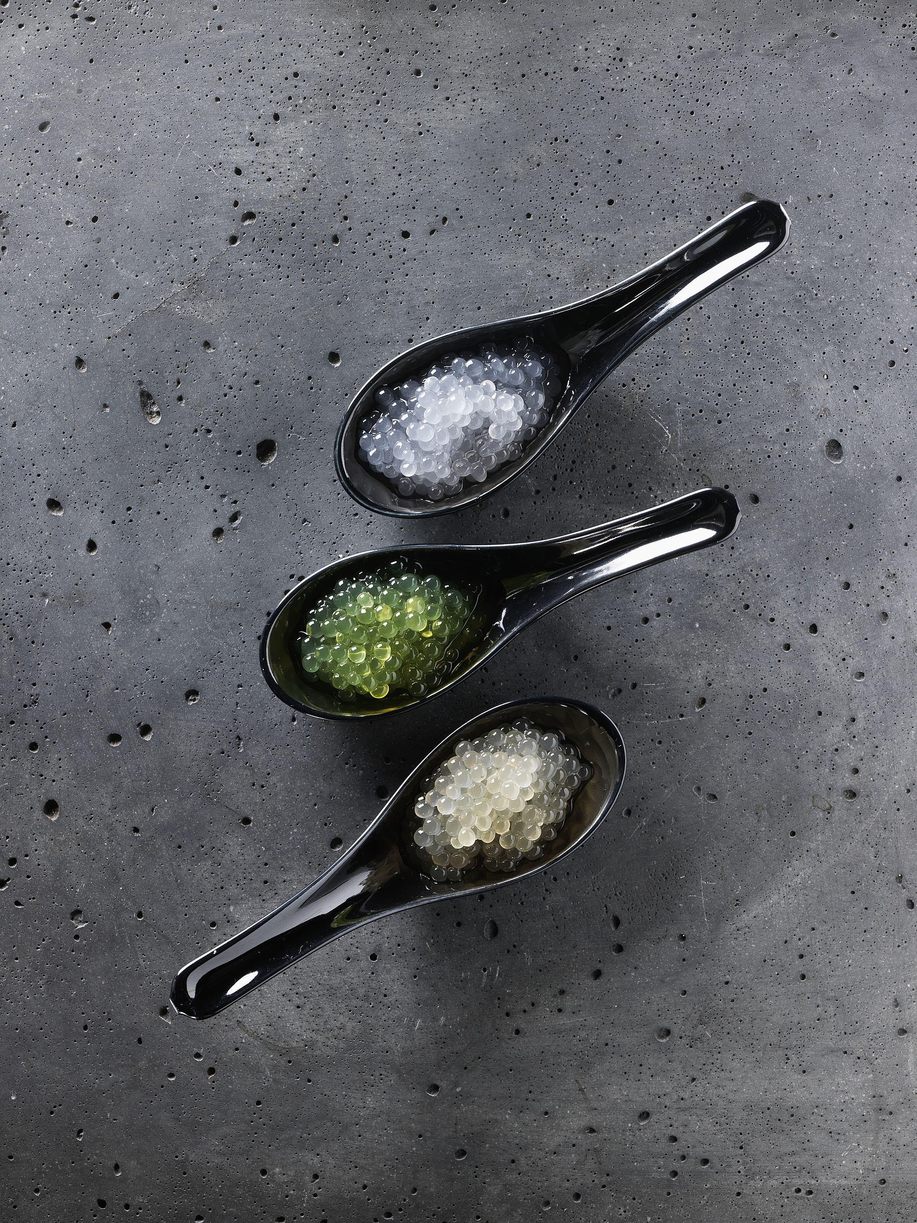 Alginat oder Calciumlaktat klingen nach Chemie, sind jedoch absolut natürlich. Alginat wird aus einer Braunalge gewonnen, Calciumlaktat kommt in Joghurt und Milchprodukten vor. So kann man Sphären und Schichten ganz natürlich herstellen. Nur das Wissen ist das Entscheidende.
