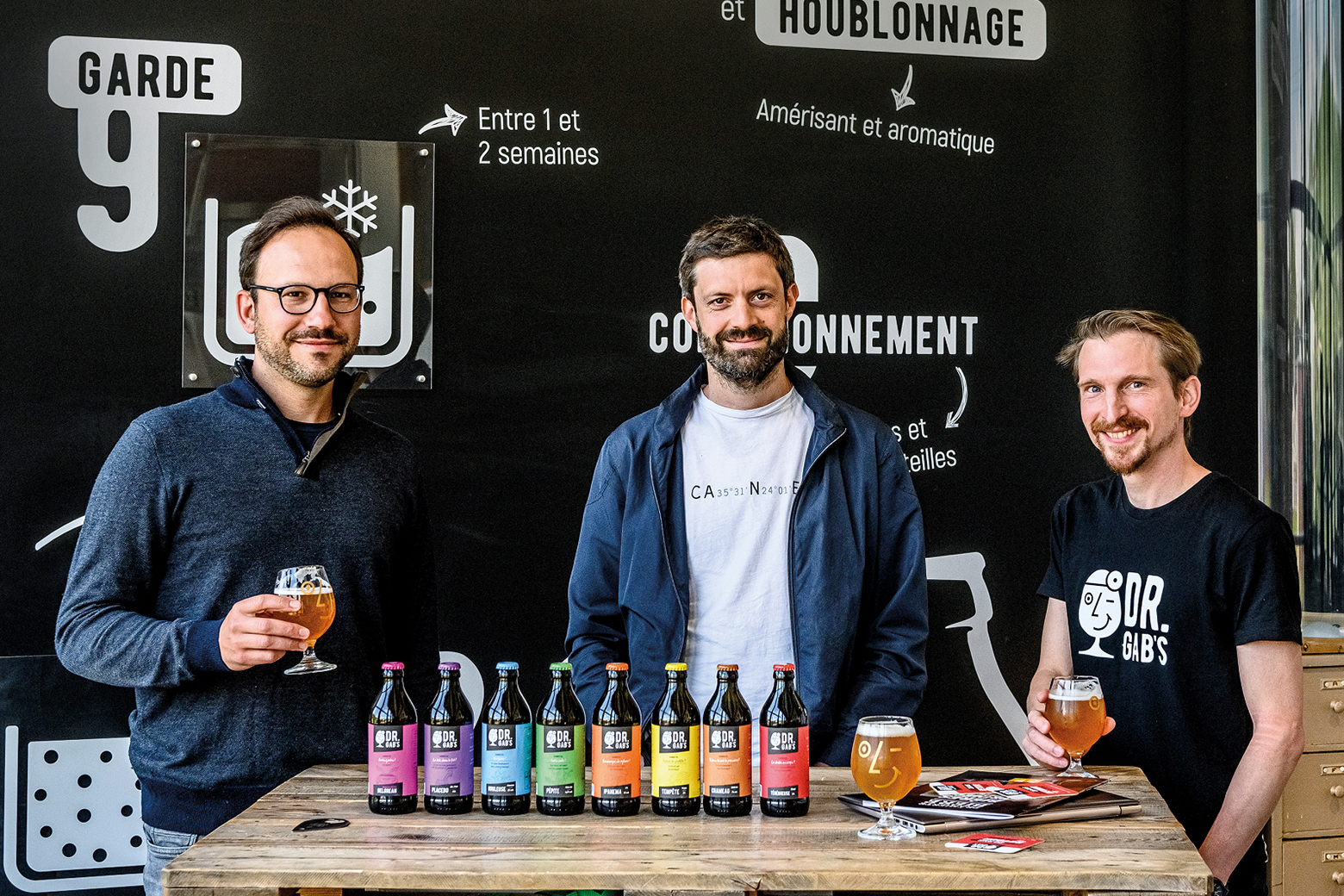 Dr. Gab’s hat mehr als fünfzig Biere entwickelt. Diejenigen, die den drei Gründern am besten schmeckten, sind immer noch dabei und haben sich zu festen Grössen entwickelt. Heute bietet die Brauerei permanent mehr als zehn Produkte an. Dazu gehören das mehrfach ausgezeichnete Jubiläumsbier 2021 «DeLorean» (Kategorie Session India Pale Ale), das «Chameau» (Kategorie Dubbel) sowie das «Tempête» (Kategorie Tripel), das «Ipanema» (India Pale Ale) oder das «Ténébreuse» (Kategorie Stout).