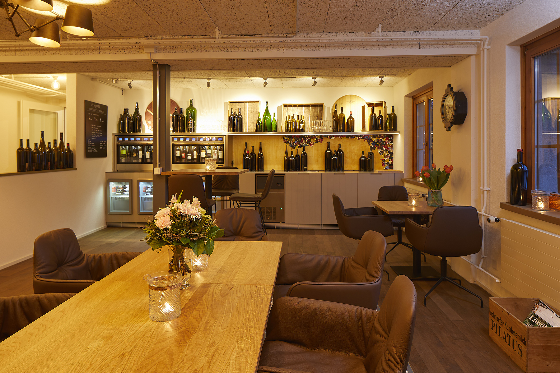 Die Reblein, die einst als Pergola den Weg zum Eingang beschatten sollen, sind noch winzig klein. «Wir haben eine Basis geschaffen, auf der wir aufbauen können», sagt Albi von Felten. «Gäste, die zu uns kommen, sollen immer wieder etwas Neues sehen und erleben.» Rechts, dort, wo es die Menschen naturgemäss hinzieht, wenn sie einen Raum betreten, befindet sich die Weinstube «für unbetreutes Trinken», wie Albi von Felten erklärt. «Mit der Winecard, einer Art Prepaid-Karte, kann Wein glasweise bezogen werden.» Vertreten sind Weine von Winzern, die ein Zimmer eingerichtet haben. Mit dem Glas Wein setzen sich die Gäste an einen der Tische in der Weinstube, in den Garten oder in die Kamin-Lounge.