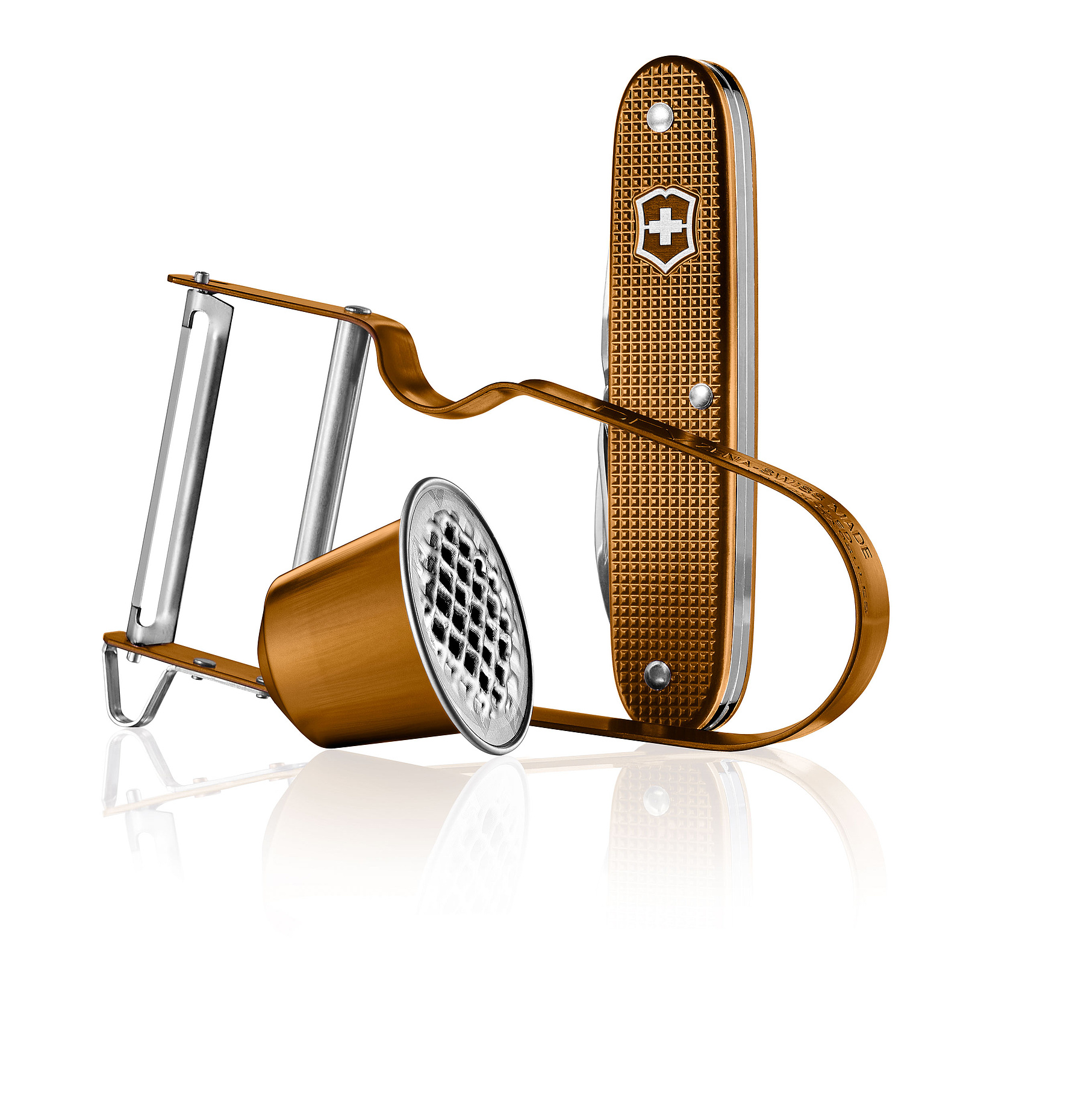 Nespresso lanciert die zweite limitierte Auflage der aus rezyklierten Aluminiumkapseln hergestellten Designobjekte: das Sackmesser «Pioneer» von Victorinox und den Zena Sparschäler «Rex» in der Farbe des Grand Cru Livanto.