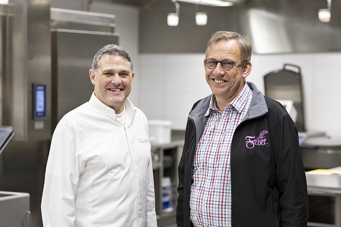 In diesem Moment betritt Pius Riechsteiner, Geschäftsinhaber der Felber AG, die Küche. Die beiden Männer begrüssen sich freundschaftlich. «Seit dem Lockdown im Frühjahr 2020 produziert Werner mit seinem Team für uns Salate, Take-away-Menüs und einige Sandwichmassen wie Poulet-Cocktail und Pilz. Im Gegenzug beliefere ich das Hotel und die dazugehörenden Restaurants mit Brot und Backwaren», erzählt Pius Riechsteiner. «Wir kaufen gemeinsam bei Pistor ein. Indem wir unsere Kräfte beim Einkauf bündeln, profitieren wir von besseren Konditionen», sagt Riechsteiner, und Rothen ergänzt: «Unsere Einkaufsgemeinschaft wollen wir weiter stärken. Zurzeit klären wir die Bedürfnisse bei den Reinigungsprodukten.»