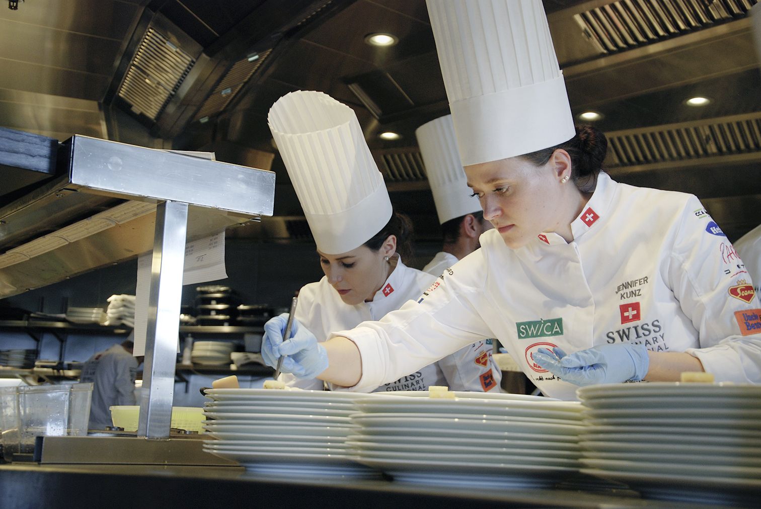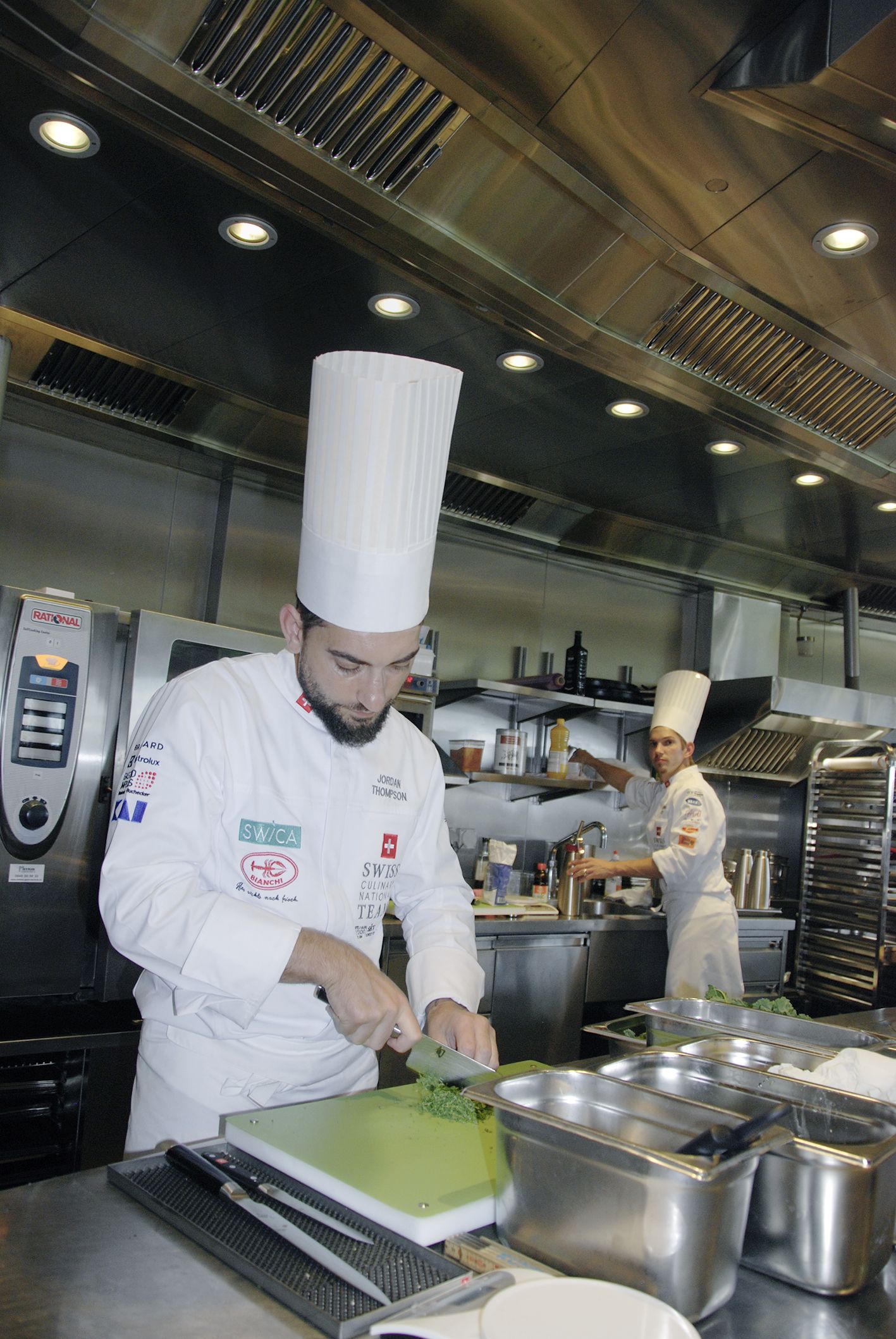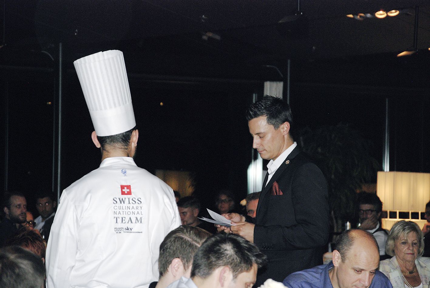 Für die Kochnationalmannschaft sind die Testläufe wichtige Standortbestimmungen. Entsprechend wird unter Wettbewerbsbedingungen gekocht: ein Drei-Gang-Menü für 110 Personen, sechs Stunden Zeit zum Vorbereiten, danach zweieinhalb Stunden Zeit zum Schicken. Dank der offenen Küche im Restaurant Pur hatten die Gäste die Möglichkeit, den Stars des Abends über die Schulter und in die Töpfe zu schauen. Wer Hektik und Nervosität erwartete, wurde eines besseren belehrt – ruhig und konzentriert arbeiteten die Teammitglieder an ihrem Menü. «Sicherlich waren wir alle nervös, immerhin war dies der erste Testlauf mit so vielen Gästen», räumte Teamchef Jordan Thompson am Ende des Abends ein. Hektik sei da aber kontraproduktiv, daher versuche man in der Küche, sich ruhig aufs Wesentliche zu konzentrieren.