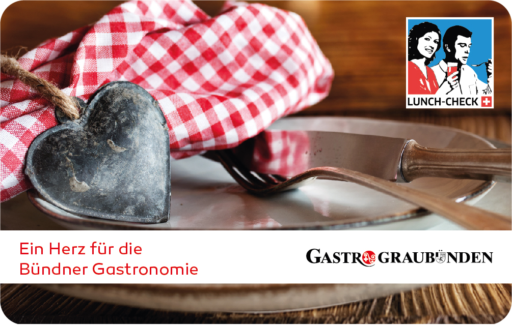 Die Unternehmen haben die Wahl, ob sie den eigenen Mitarbeitern eine Lunch-Check Karte schenken möchten, die nur in Restaurants in Graubünden oder in der ganzen Schweiz einlösbar ist. Die exklusive Bündnerkarte erscheint in einem eigenen Design mit der Aufschrift Ein Herz für die Bündner Gastronomie und ist zeitlich unbeschränkt einlösbar (Mo-So; 7x24h). Das heisst, Lunch-Check kann auch für ein Abendessen eingelöst werden. Die Karten können direkt im Web-Shop von Lunch-Check bezogen werden.