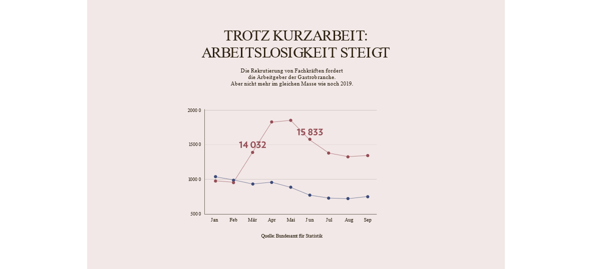 Laut Roland Eng, Inhaber der Personalvermittlungsagentur Active Gastro mit Sitz in Zürich, ist der Anstieg der Arbeitslosen noch nicht stark zu spüren. «Die meisten sind in Kurzarbeit und warten ab. Wir hatten sogar schon Fälle, da wurden Gespräche kurzfristig wieder abgesagt, weil die Kurzarbeit im Betrieb verlängert worden war», sagt er. Die Betriebe seien verständlicherweise sehr bemüht, die guten Leute zu behalten. «Bewerbungen erhalte ich derzeit vor allem von gut ausgebildeten Leuten aus Tschechien, der Slowakei und Ungarn», sagt er.