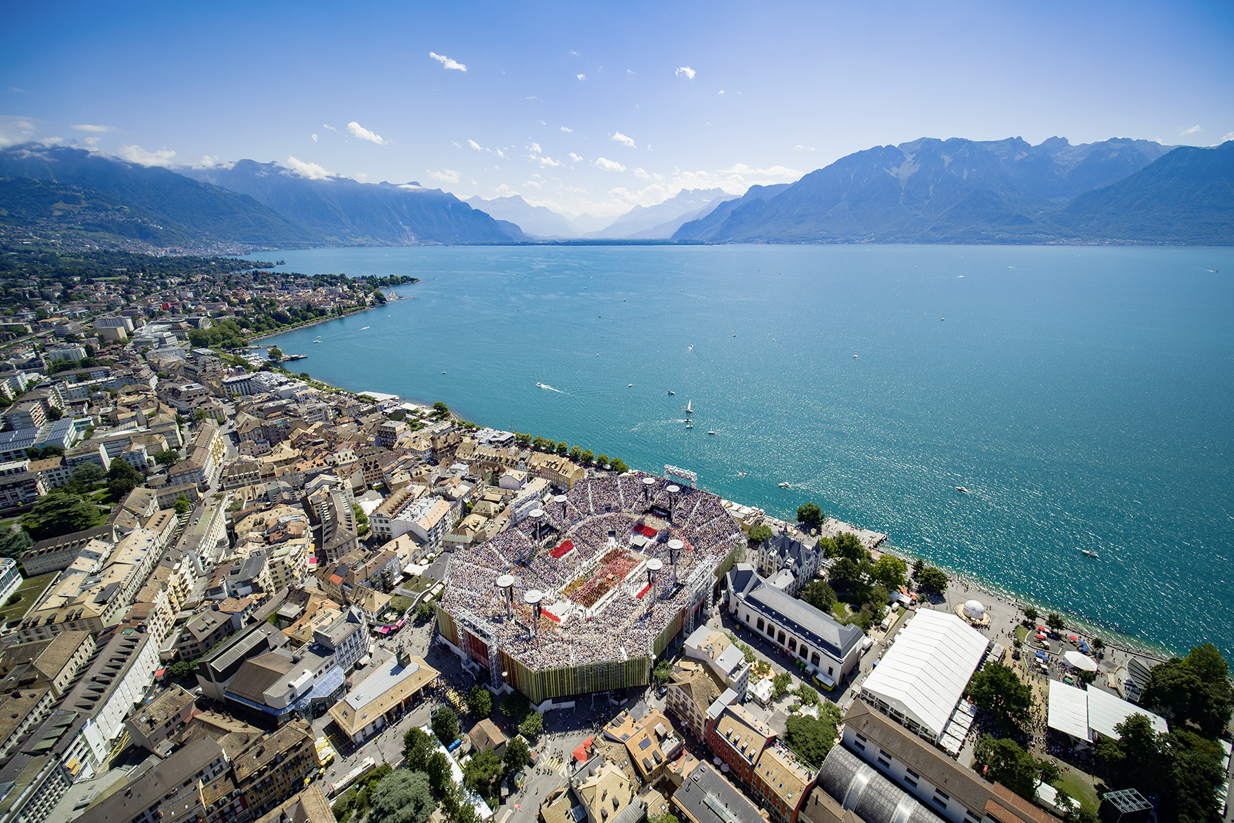 Die eigens für die Fête des Vignerons gebaute Arena füllte den Marktplatz von Vevey bis auf den letzten Millimeter. Zwischen den Altstadthäusern waren nur einzelne Fragmente davon zu sehen. Weil niemand die Arena als Ganzes sah und diese kein Dach hatte, wirkte das Bauwerk im Innern enorm gross. Mit 20 000 Sitzplätzen bot sie mehr Zuschauern Platz als Vevey Einwohner hat. Eine kleine Zuschauergruppe initiierte eine Welle, die zum Tsunami wurde und sicher zehn Runden in der Arena machte, bevor die Show begann. Ein magischer Moment. 375 000 Besucher sahen die von Daniele Finzi Pasca inszenierte Show. Der Tessiner Regisseur konzipiert Opern und hat Eröffnungs- und Schlussfeiern von Olympischen Spielen entworfen. Für die Fête des Vignerons zeichnete er die Verbindung von Mensch und Natur in kindlicher und spielerischer Verzauberung. So erinnerten Julie und ihr Grossvater an Heidi und die Spielkartensoldaten an Alice im Wunderland. Natürlich nutzte Finzi Pasca auch neueste Technologien. Der Boden der Arena beispielsweise war ein riesiger Bildschirm. Grafische Elemente wiesen der Marschmusik ihre Formationen zu oder zeigten eine Blumenwiese für «Le Ranz des Vaches». Das Publikum dankte Daniele Finzi Pasca und den rund 5500 Darstellern mit tosendem Applaus.