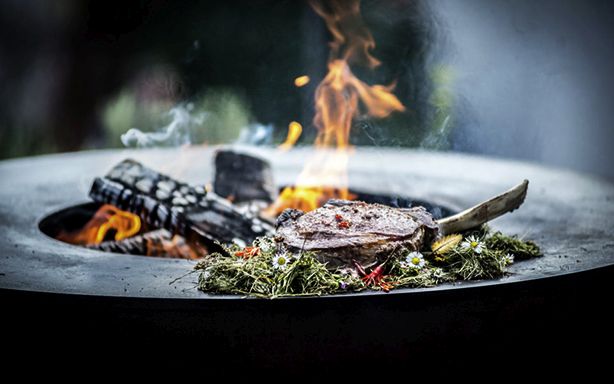 Die Metallschale mit dem breiten, nach innen gerichteten Rand ist als Feuerstelle ein Hingucker.