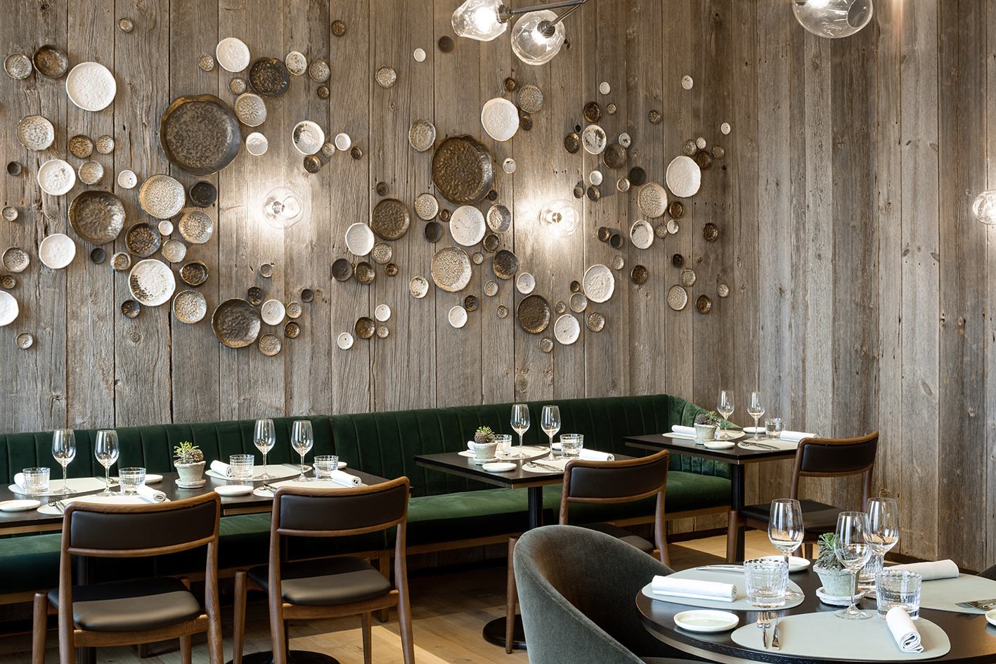 Il s’articule autour de deux espaces: d’un côté, la cuisine ouverte, avec ses longues tables invitant au partage et à la convivialité, idéales pour venir en groupe ou en famille partager un plateau de fruits de mer; de l’autre, le restaurant à proprement parler, adossé au camaïeu minéral de la paroi, avec son cadre plus intimiste et feutré, ses banquettes et petites tables, son parquet et ses luminaires minimalistes à la danoise. Le Fiskebar réunit ainsi une quarantaine de couverts en tout.