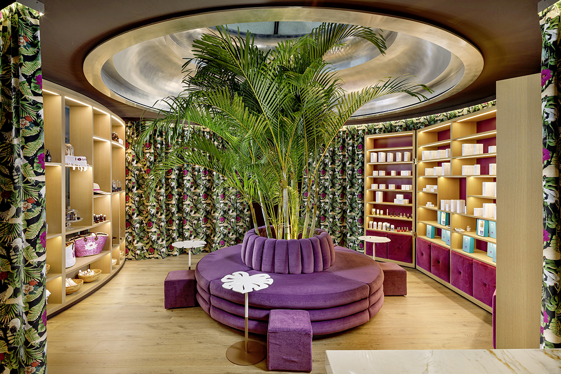 Nun sind auch in der neuen Spa-Lobby dieselben kräftigen Farben und floralen Muster ein-gekehrt. Eine Palme streckt sich mittendrin Richtung Atrium. Und auch der Empfangstresen wurde von Pouzet mit künstlerischen Elementen verziert. Durch den Umbau im Spa wurde ein zusätz-licher Behandlungsraum geschaffen, was die Gesamtzahl der Räu-me auf acht erhöht. Neu ist der Aveda-Haarsalon in den Spa-Bereich integriert.