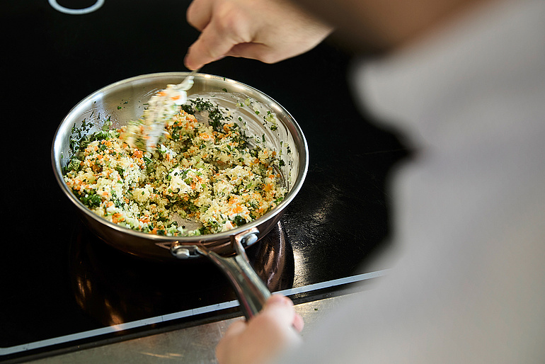Der Couscous enthält neben vielen Kräutern Gemüse und Salz-Zitronen. Zum Schluss wird der Couscous in Mangoldblätter gewickelt.