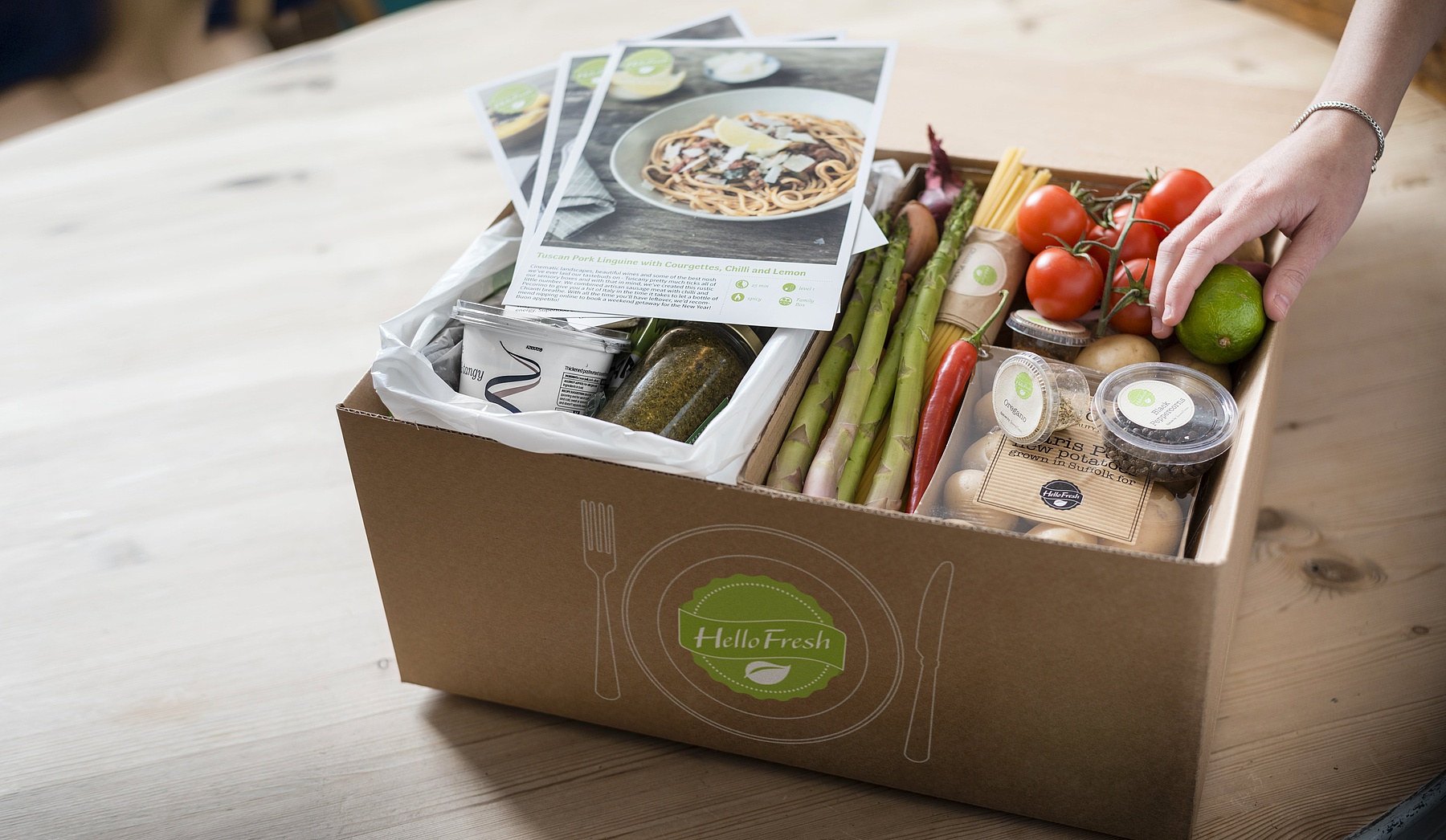 Zum Schweizer Markteinstieg stehen drei Boxen zur Auswahl: Für den schnellen Kochspass gibt es die „Express Box“ mit abwechslungsreichen Gerichten, die innert rund zwanzig Minuten zubereitet sind. Hobbyköche können sich von der „Explore Box“ inspirieren lassen und innert zirka vierzig Minuten ihre Kochkünste verbessern. Als drittes Angebot sorgt die „Family Box“ mit einer Kochzeit von etwa dreissig Minuten für Kochspass mit der ganzen Familie. Bereits erprobte Rezepte aus der HelloFresh-Küche werden überarbeitet und durch neue, lokale Kreationen ergänzt. Ein besonderes Augenmerk gilt dabei der ausgewogenen Kombination von Kohlenhydraten, Proteinen und Fetten mit Vitaminen und Mineralstoffen. HelloFresh setzt hierzulande zudem vorwiegend auf Bio-Qualität und das Fleisch stammt ausschliesslich aus der Schweiz. Eingekauft wird grösstenteils direkt bei lokalen Produzenten, dann gelangen die Produkte zum Verpacken in ein Lager und anschliessend per Post zum Kunden. Damit bricht HelloFresh auch die traditionelle Lebensmittel-Lieferkette auf. Während bisher zwischen Produzenten und Verbrauchern noch Grosshändler, Warenhaus und Detailhändler standen, sind es mit HelloFresh nur noch drei Stationen. HelloFresh spart mit diesem Modell sieben Tage in der Lieferkette.