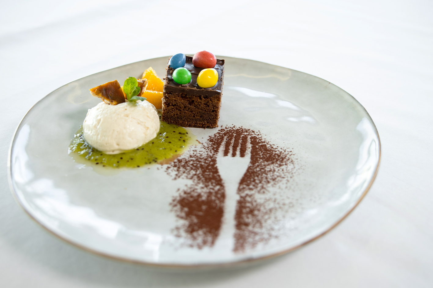 3. LehrjahrGelb, weiss und rot leuchtete die Vorspeise. Bunt war der Hauptgang. Vielfarbig war auch das Dessert mit knusprigem M & M-Schoko-Kuchen, Orangenfilets und Randenschaumgefrorenem.