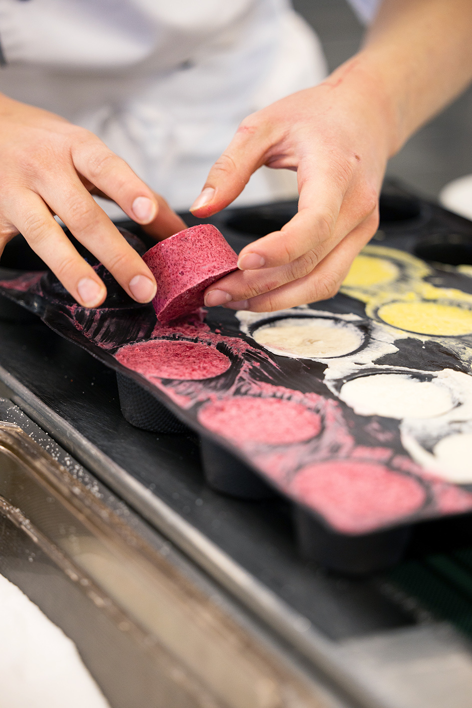 2. LehrjahrVier Elemente brachte sie auf die Teller: Erde in Form von Randen, scharfe Gewürze als Feuer, luftige Meringue und M & M in den Farben des Wassers.