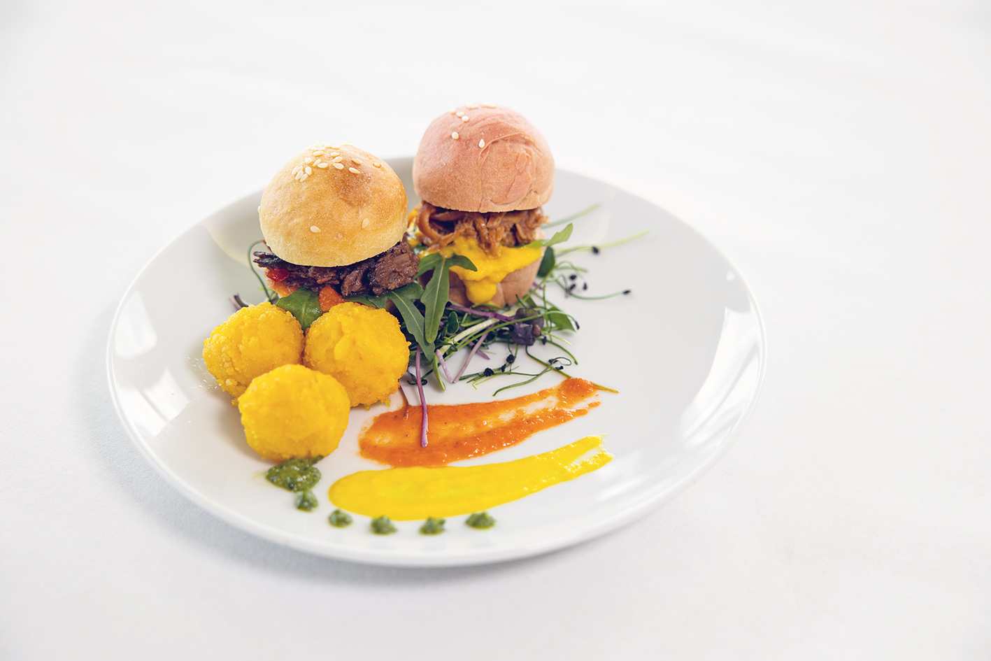 3. LehrjahrEr mag ordentliches Kochen und präzises Abschmecken. Auf zweifarbigem Rüebli-Schachbrett platzierte er je drei Risotto-Kugeln, Broccoliröschen und Stücke vom Schweinshuftbraten.