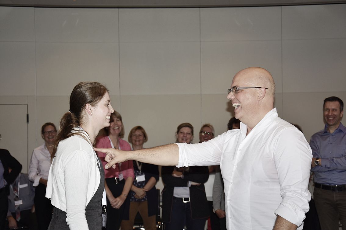 Welche Wirkung es hat, wenn man sich auf die Lösung statt auf das Problem konzentriert, zeigte eine andere Übung eindrücklich: Christian Daniel Mayer legte den Finger auf den Hals einer Teilnehmerin und forderte sie auf, auf ihn zuzulaufen. Unmöglich – sie konzentrierte sich auf die Luft, die ihr dadurch abgeschnitten wurde. Also dieselbe Übung noch einmal, aber diesmal sollte sich die Teilnehmerin nicht auf ihren Hals konzentrieren, sondern auf ihr Ziel. Und tatsächlich, dank dem neuen Fokus konnte der Coach sie nicht mehr aufhalten.