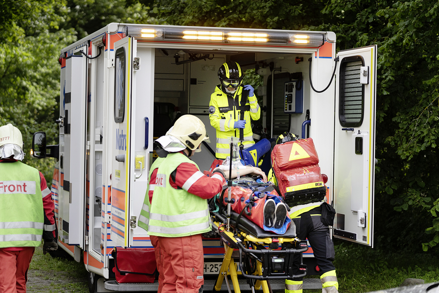 Sind die Rettungskräfte alarmiert, richtet sich die Aufmerksamkeit auf die verletzte Person. Ist sie bei Bewusstsein, geht es darum, ihr die Wartezeit so sicher und angenehm wie möglich zu machen. Dazu gehört, dass man sie – und allfällige Angehörige – beruhigt und sich um die Verletzung kümmert. Bei Verbrennungen heisst das: Die Haut sofort und ausschliesslich mit kaltem Wasser kühlen. Kleider, die am Körper kleben, dürfen auf keinen Fall entfernt werden.