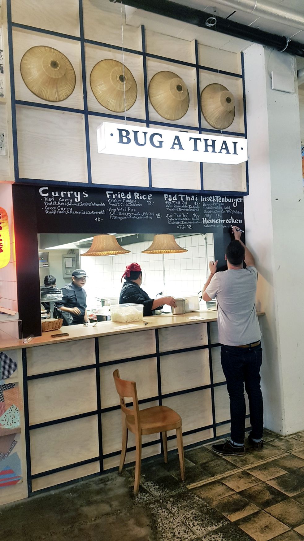 Die neu eröffnete Markthalle «Klara 13» in Kleinbasel ist um eine Food-Attraktion reicher: Zwischen Mexikanern, Japanern, Äthiopiern und Argentiniern tummelt sich auch ein Thailänder. «Bug a Thai» heisst der Imbiss, der auf den Insekten-Zug aufspringt. Mittags gibt es traditionell Thailändisches: gebratenen Reis, Nudeln und Currys. Am Abend wird eigentlich auch Traditionelles gereicht – dann jedoch einheimisch traditionell. Insekten sind dortzulande nichts Aussergewöhnliches.