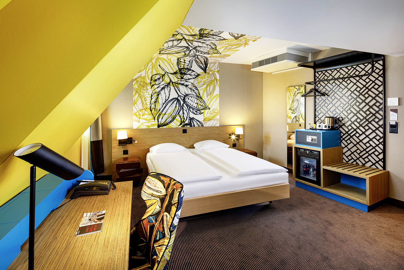 Diese Individualität zeigt sich im Swiss Chocolate Hotel überall. Zum Beispiel an Nachttischchen, die an einen Stapel Schokoladenstücke erinnern, an Türschildern in Form von Tafelschokoladen sowie an Tapeten und Stuhlbezügen, die Cacaopflanzenmotive zeigen. Porträts von Schweizer Schokoladenpionieren wie Cailler oder Suchard zieren die Gänge. In der Lobby steht ein Schokoladenbrunnen. Die Hotelgäste können je nach Tagesangebot Biscuits, Marshmallows oder Obststücke in die 65 Grad warme, flüssige Milchschoggi dippen.