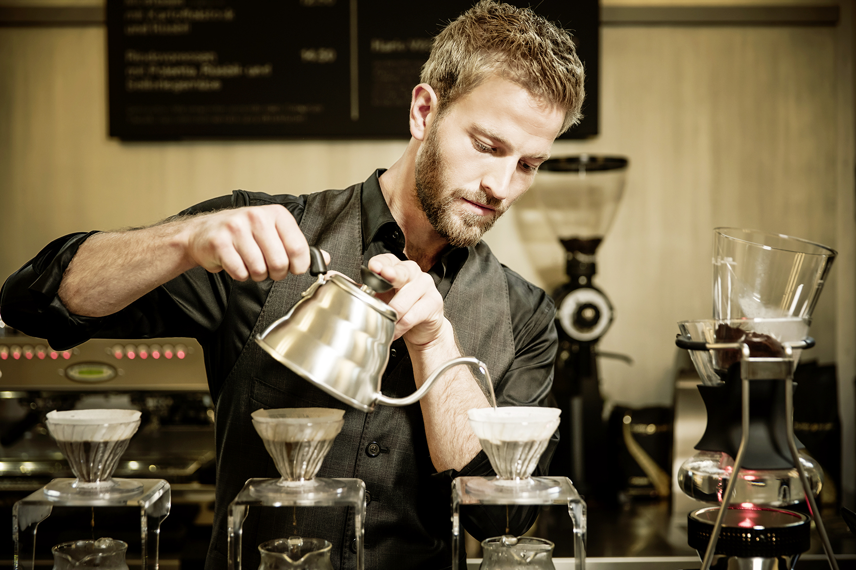 Diese Brühmethoden bieten zudem mehr als Kaffee auf Knopfdruck. Roger Bähler beschreibt das Szenario: Filterkaffee wird in einer formschönen Chemex-Kanne aus Glas und Holz direkt am Tisch zubereitet und in einer Porzellantasse serviert, so dass sich die Aromen besser entfalten können. «An so etwas erinnert sich der Gast eher als an einen gewöhnlichen Milchkaffee.» Und: «Für den Gastronomen ist das kein grosser Mehraufwand – ausser, dass er vielleicht mehr Kaffee verkaufen muss.»